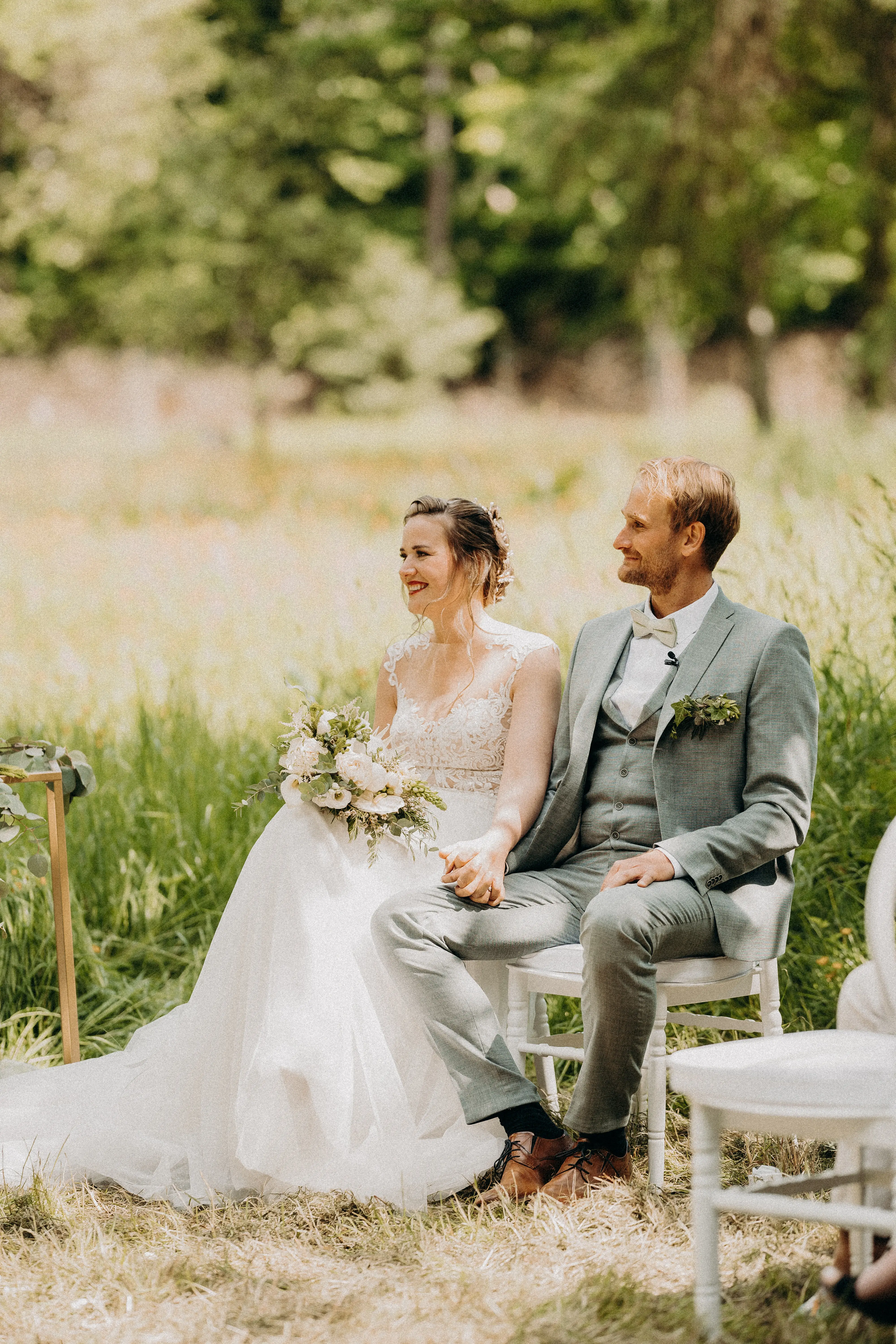 Am Morgen des großen Tages planierten das Paar und einige Helfer einen Waldweg, um einen problemlosen Zugang zum Trauort auf einer Wiese zu ermöglichen. Außerdem wurden letzte Handgriffe an Deko und Unterhaltungsoptionen erledigt. Gegen Mittag machte sich der Bräutigam bei den Brauteltern fertig, während zur Braut Make-up- und Haar-Stylistin sowie einige Freundinnen nach Hause kamen. Um 15 Uhr führte der Brautvater seine Tochter zur Zeremonie. Gemeinsam mit Traurednerin Stefanie Burger hatten sich die Hochzeiter das außergewöhnliche Ritual „Wir packen unseren Koffer für eine erfolgreiche Ehe“ ausgedacht. „Alle Hochzeitsgäste legte Wünsche und Tipps in meinen Reisekoffer“, erklärt Julian. „Die Trauung war superschön. Alle haben so viel gelacht“, erinnert sich Julia.