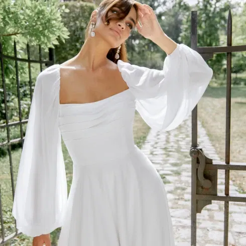 Wir sind schockverliebt in lange, voluminöse Ärmel! Besonders in die luftige Variante, auch Bischofsärmel genannt, bei der der weite Ärmel locker um den Arm fällt und am Handgelenk, zum Beispiel mit einem Bündchen, einer Manschette oder einer Schleife, zusammenläuft. Sie verleihen deinem Brautlook eine romantische und elegante Note.