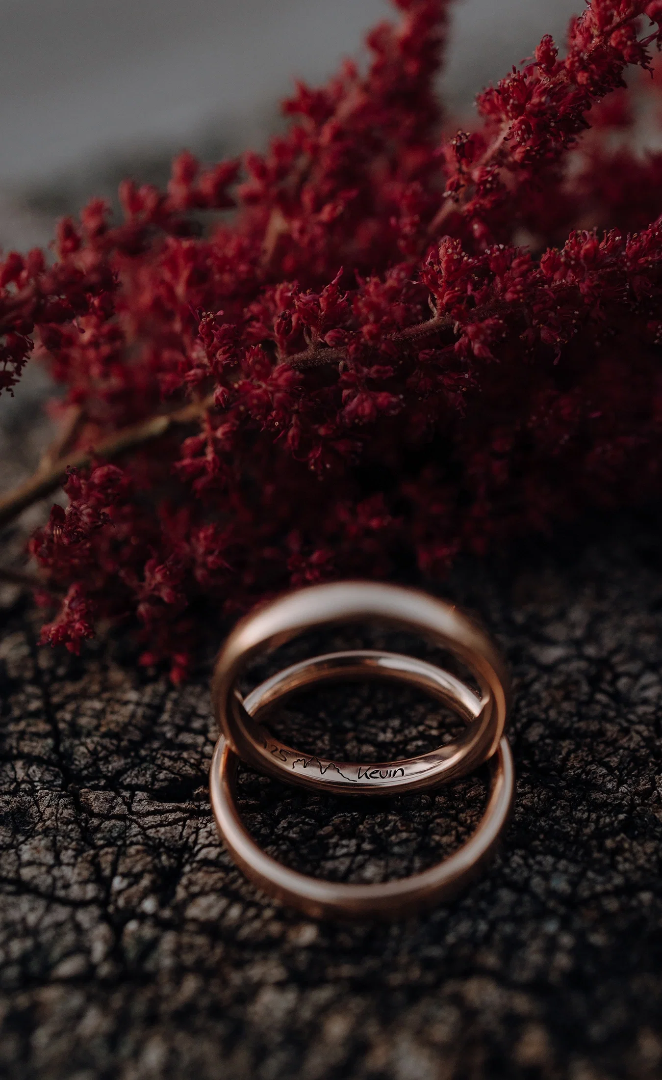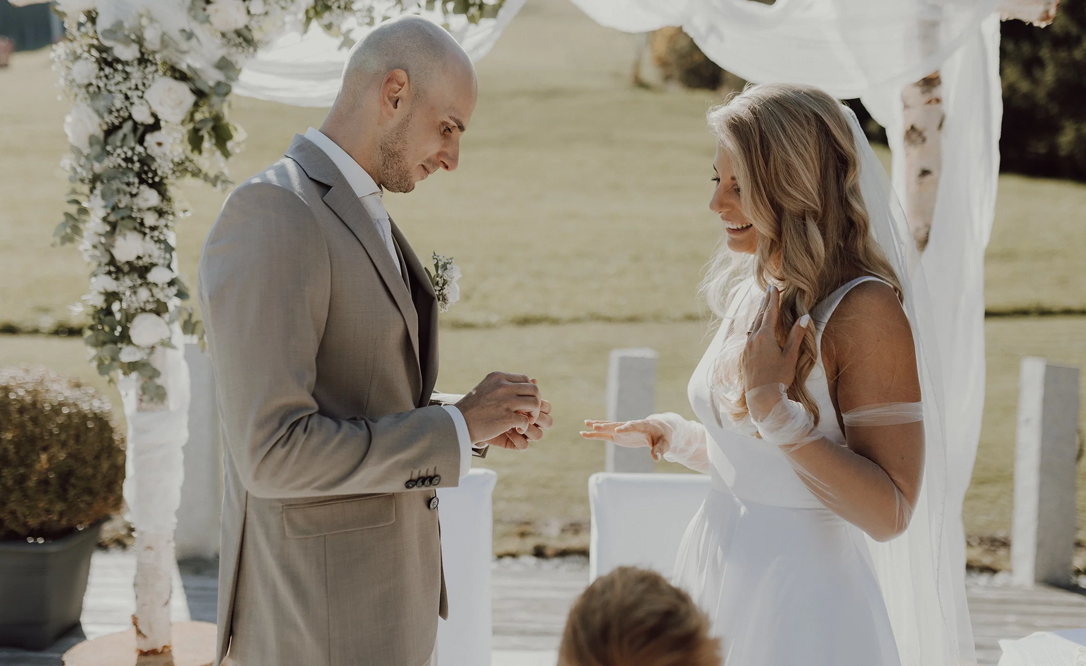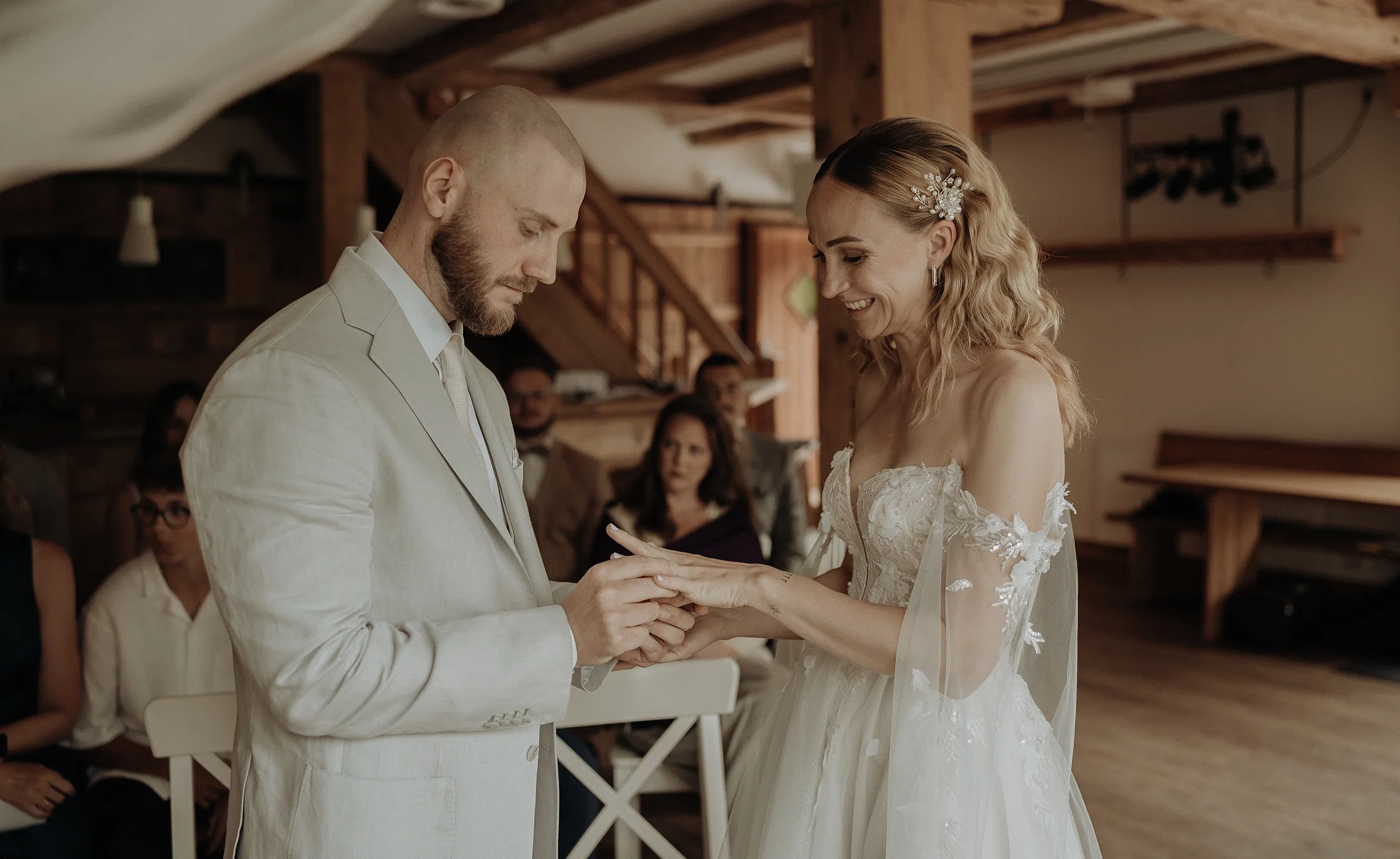 Der Ringtausch von Melanie und Andreas war kurz, intensiv und voller Bedeutung. „Man weiß in diesem Moment einfach: Jetzt sind wir wirklich verheiratet“, erzählt Melanie. Auch wenn der Augenblick schnell vorbeiging, war er von großer Konzentration und Emotion geprägt. „Der Ringtausch ist ein Moment zum Innehalten – man ist ganz bei sich und bei dem, was gerade passiert.“ Der Ringtausch fand während der kirchlichen Trauung statt und wurde vom Lied „Das Heiligste der Welt“ von Berge begleitet. Statt eines klassischen Ringkissens nutzte das Paar eine selbst gestaltete Holzscheibe mit Trockenblumen. Die Ringe wurden zunächst von Andreas’ Patenkind Simon (6) und dessen jüngerem Bruder David (3) in die Kirche getragen – der gemeinsame Sohn des Paares, Florian (2), verschlief den Moment. Ihre Trauringe fanden Melanie und Andreas bei 123 Gold in Innsbruck. Die Möglichkeit, die Ringe individuell zu gestalten, überzeugte sie sofort. Schon beim ersten Termin entschieden sie sich für goldene, gehämmerte Ringe. Melanies Ring ist zur Hälfte mit Steinen besetzt, Andreas’ Ring schlicht gehalten. Die Kosten lagen bei insgesamt 2.560 €.