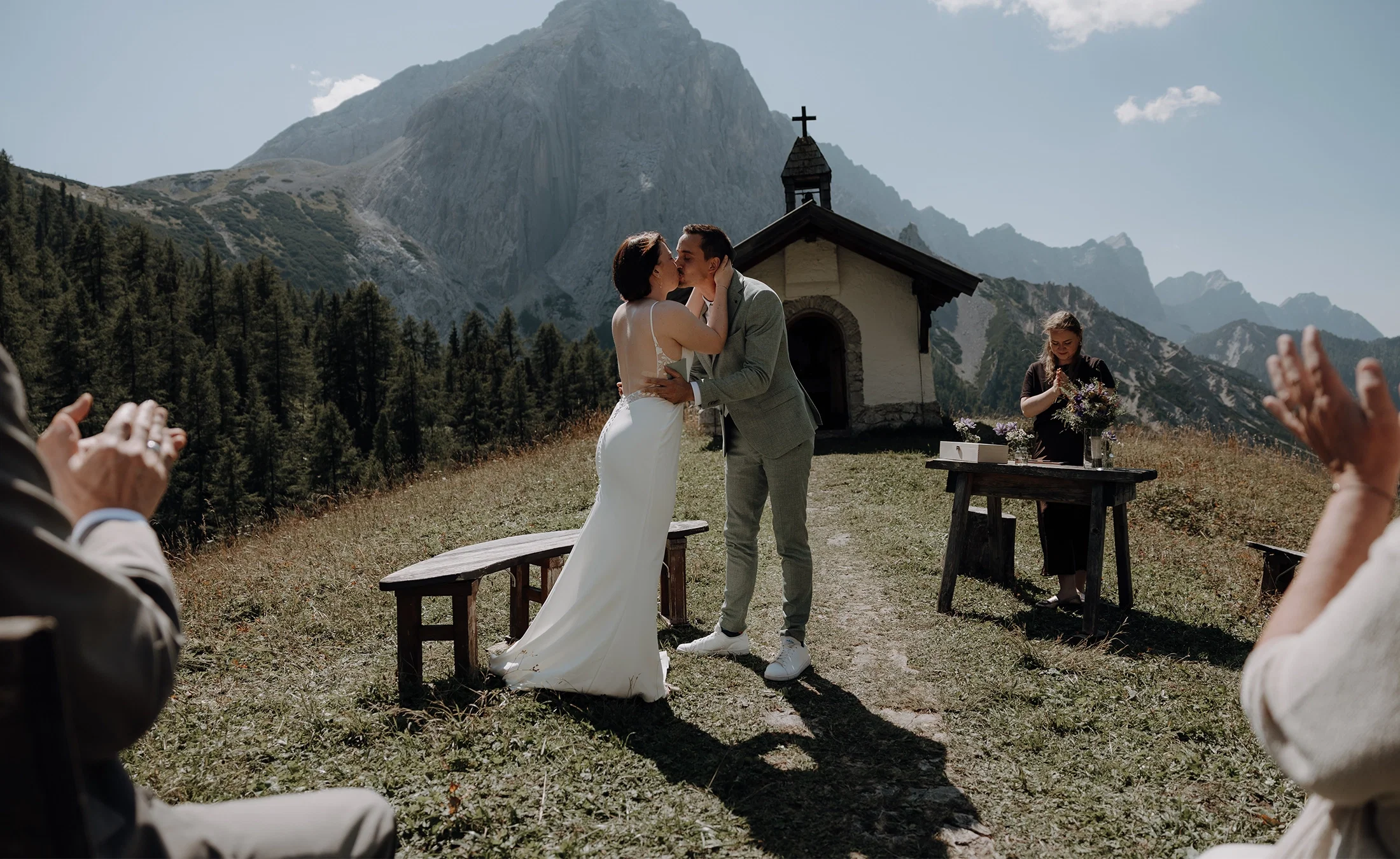 Bei der freien Trauung in St. Johann in Tirol tauschten Sarah und Andreas ihre Ringe. Und das vor beeindruckender Bergkulisse und mit einem ganz persönlichen, musikalischen Moment. Begleitet von Sarahs Schwester, die ihr gemeinsames Lied „Ehrenwort“ von Fäaschtbänkler sang, steckten sie sich während der Zeremonie die Ringe an – ein intimer Augenblick voller Gefühl. Für einen besonderen Auftritt sorgte Ringträger Flo, der als „Ring Security“ zum Mission Impossible-Themensong die Ringe nach vorn brachte. Ihre Trauringe ließen Sarah und Andreas beim Juwelier Wimmer in St. Johann in Tirol anfertigen. Das Gold stammte aus einem geerbten Ring von Sarahs Großmutter, der für die neuen Ringe eingeschmolzen wurde. Sarah trägt einen klassischen Goldring mit kleinem Stein, Andreas einen Ring in Weißgold mit Schraffur und goldenem Abschluss. Im Inneren sind ein Unendlichkeitszeichen, Namen und das Hochzeitsdatum graviert. Für Design und Zusatzmaterial zahlte das Paar rund 900 €.