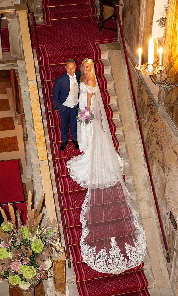 die Suche nach dem perfekten Brautkleid wurde für Jasmin zu einer kleinen Herausforderung. Ursprünglich bestellte sie ihr Kleid bereits im Januar und erhielt es erst im Juni zur Anprobe. Es war eigens für sie designt – doch zur großen Enttäuschung stellte sich heraus, dass es deutlich zu kurz angefertigt worden war. Eine Änderung wäre zwar möglich gewesen, hätte aber den gesamten Charakter des Kleides genommen. Nach einem fairen Gespräch mit der Geschäftsführung des Geschäfts bekam Jasmin ausnahmsweise ihre Anzahlung zurück. Nun blieb ihr nur noch wenig Zeit – in letzter Sekunde musste ein neues Brautkleid her. Schließlich fand sie ein traumhaftes Kleid bei Roméo & Juliette, das sofort ihr Herz eroberte: ein Modell, das von oben bis unten aus feiner Spitze bestand. Die Spitze selbst zeigte ein leicht venezianisches Muster, das perfekt zum Flair ihrer Hochzeit passte. „Jede einzelne Spitze war mit einer zarten goldenen Naht eingefasst”, schwärmt Jasmin. Dazu trug sie eine beeindruckende Schleppe von etwa eineinhalb bis zwei Metern Länge und einen fünf Meter langen Schleier.