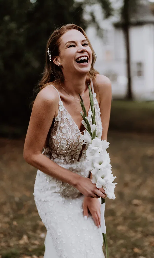 Als Blumenfan war der Braut die Floristik besonders wichtig. Die Hauptrolle sollten weiße Gladiolen spielen. Die weitere Blumenwahl fiel passend zum Farbschema weiß und grün aus. Melanie Dienemann erfüllte Annas Wünsche perfekt.