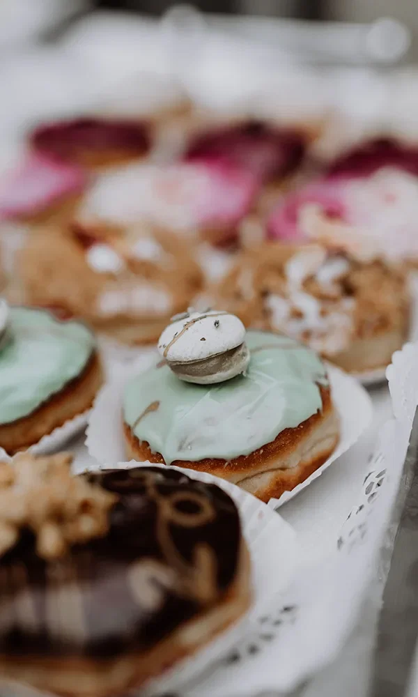 Neben der Hochzeitstorte wünschte sich das Paar die ausgefallenen Kreationen von Sugarclan: Berliner Pfannkuchen in den unterschiedlichsten Geschmacksrichtungen wie Bienenstich, Apple Pie oder Milchreis Rote Grütze.