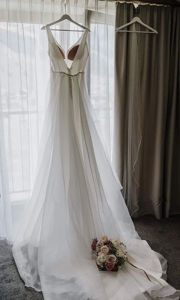 Für Jil war die Suche nach ihrem Brautkleid überraschend unkompliziert. „Ich war bei Marry Me in Dötlingen, einem Geschäft ganz in der Nähe unseres Wohnorts“, erzählt sie. „Ich wusste ziemlich genau, was ich wollte – ein cleanes, schlichtes Kleid ohne viel Spitze oder Schnörkel.“ Schon beim vierten Kleid war klar: Das ist es. „Es war figurbetont, mit feinen Trägern, einer eleganten Knopfleiste am Rücken und einer abnehmbaren Schleppe“, beschreibt Jil. Ein besonderes Detail war der Überrock aus leichtem, transparentem Stoff, der dem Look beim Einzug eine festliche Note verlieh und später für die Party einfach abgenommen werden konnte. „So konnte ich mich ganz frei bewegen – perfekt für unseren Tag in den Bergen.“