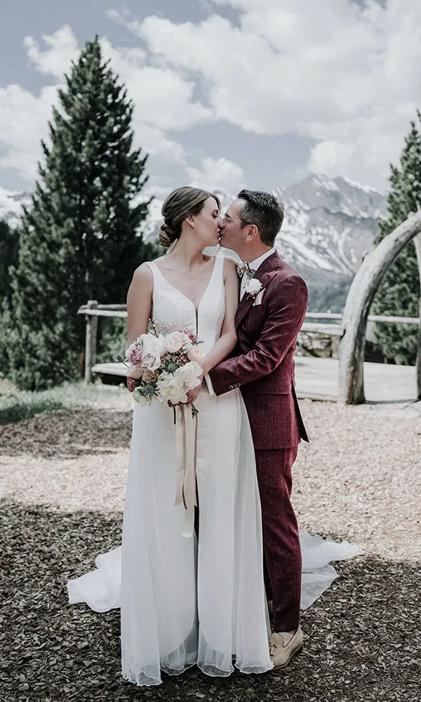 Steffens Hochzeitslook war das Ergebnis eines längeren, sorgfältigen Prozesses. „Ich habe meinen Anzug bei Rooks & Rocks in Berlin anfertigen lassen – komplett maßgeschneidert“, erzählt er. Gemeinsam mit seinem Trauzeugen war er mehrmals dort, um Stoff, Schnitt und Accessoires perfekt abzustimmen. Es ging um jedes Detail – vom Material über die Weste bis hin zur Frage: Fliege oder Krawatte? Am Ende fiel die Wahl auf einen dreiteiligen Anzug in einem warmen Rotton, der wunderbar mit der Bergkulisse und Jils modernem Kleid harmonierte. „Wir wollten etwas, das auffällt, aber trotzdem elegant bleibt – und die Farbe passte einfach perfekt.“ Dazu kombinierte Steffen eine passende Fliege, Weste und ein Einstecktuch, verzichtete bei sommerlichen Temperaturen aber auf Socken. „Ich trug Loafer – das war bequem, stilvoll und passte ideal zum entspannten Look unserer Feier in den Bergen.“