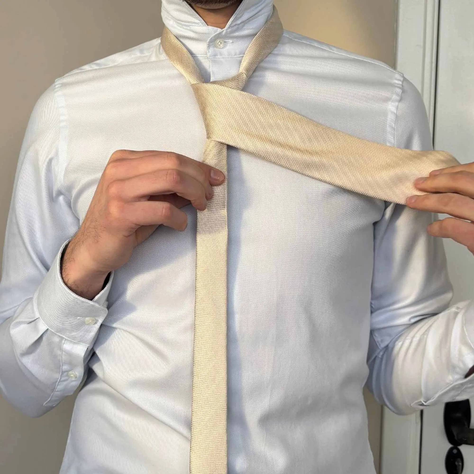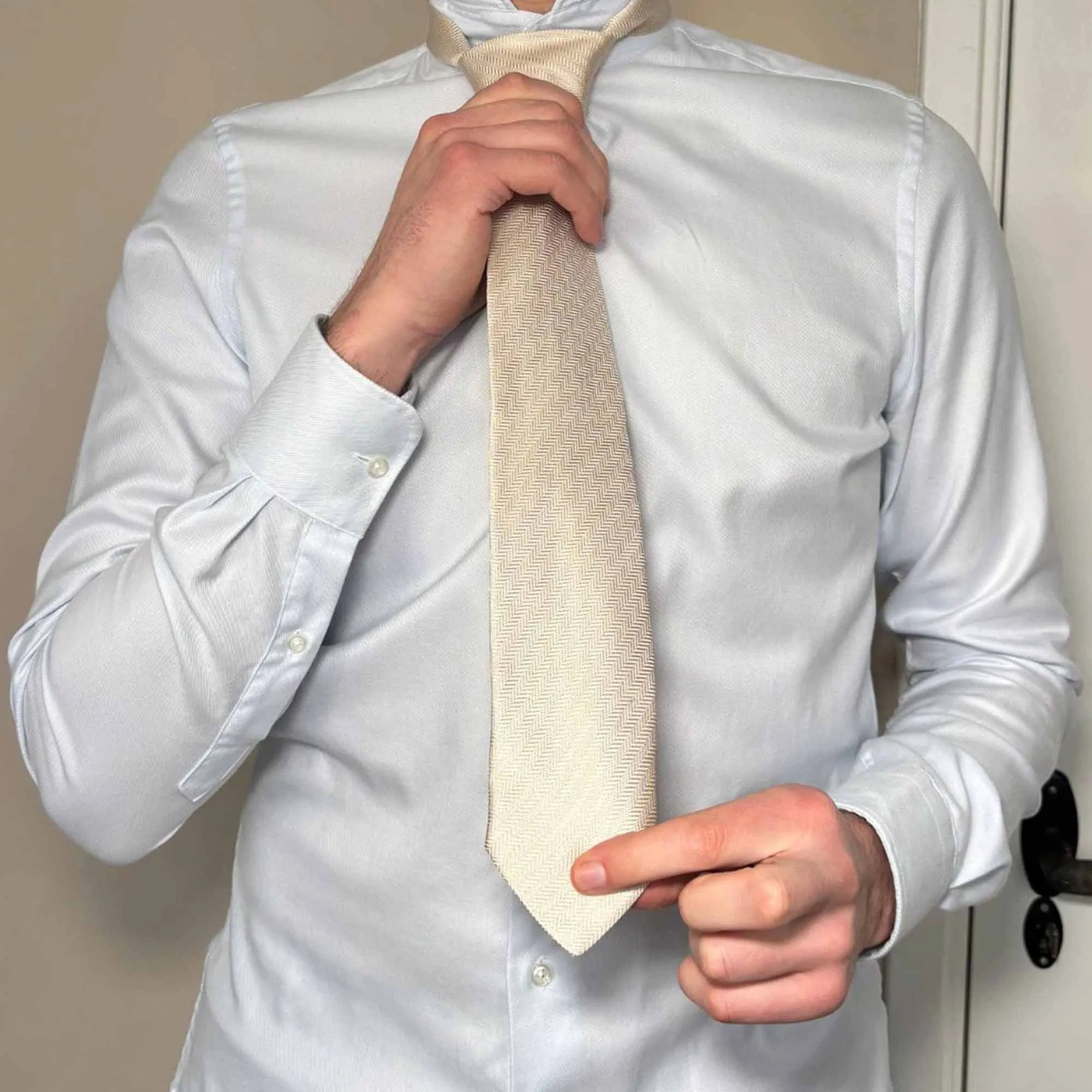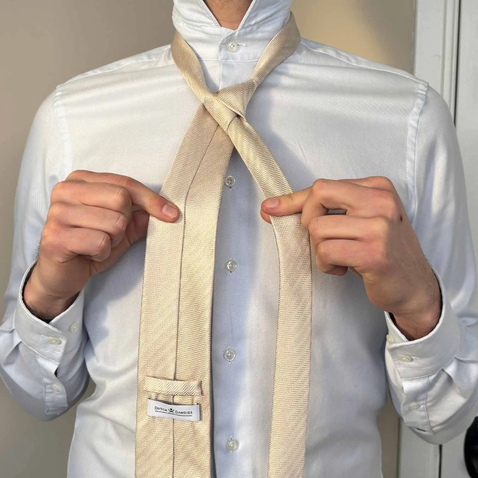 Die Länge eures Körpers bestimmt im Wesentlichen die Länge der Krawatte – beide sollten in einem angemessenen Verhältnis zueinanderstehen. Wenn die untere Spitze der Krawatte gerade den oberen Rand eures Hosenbundes berührt, ist die Länge perfekt.