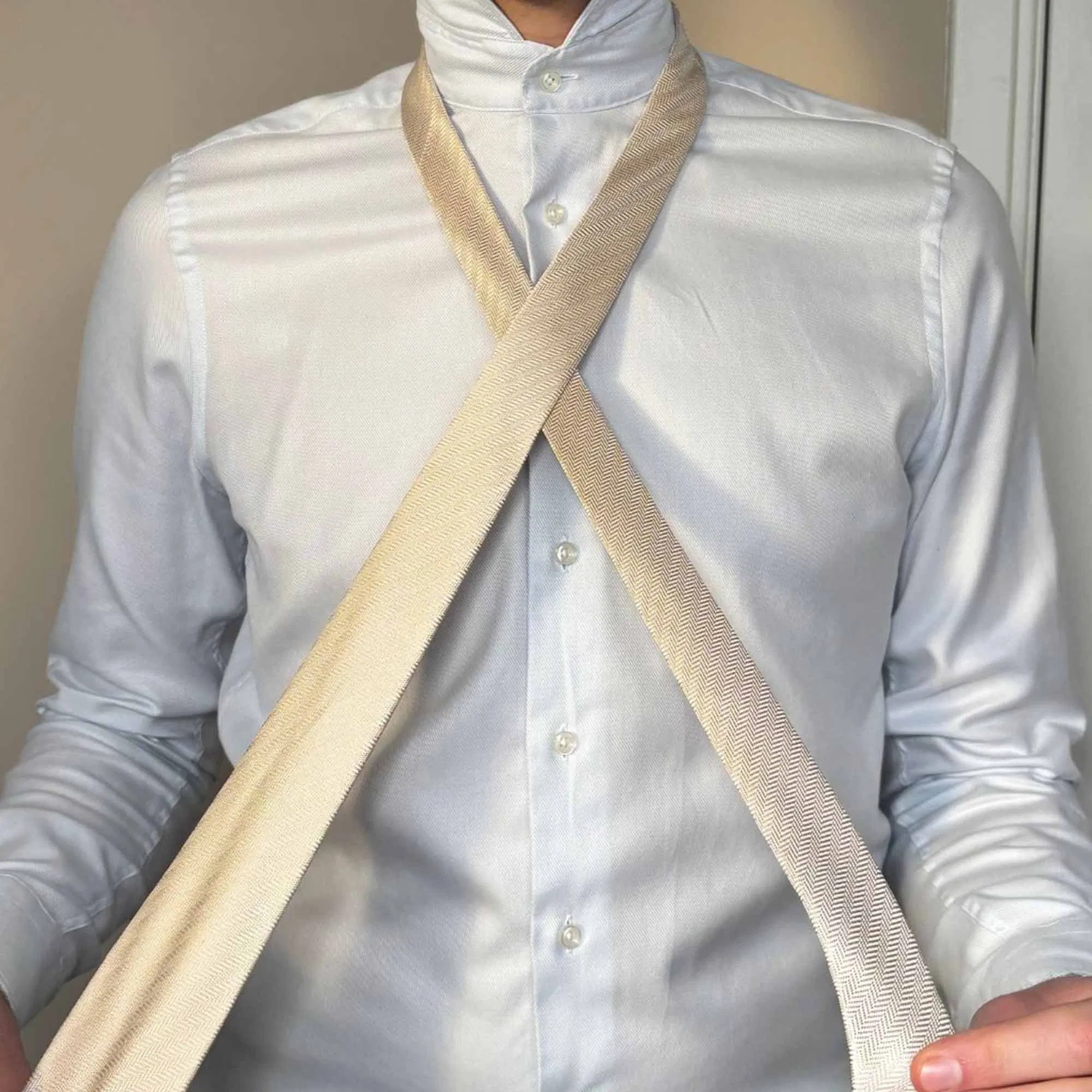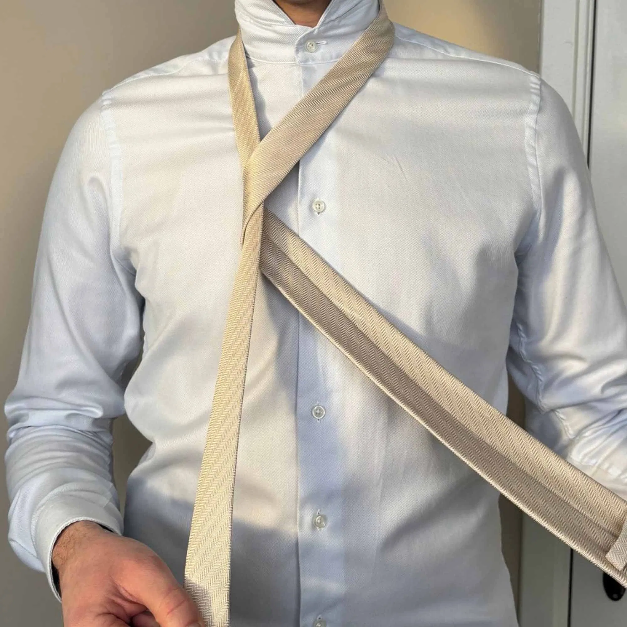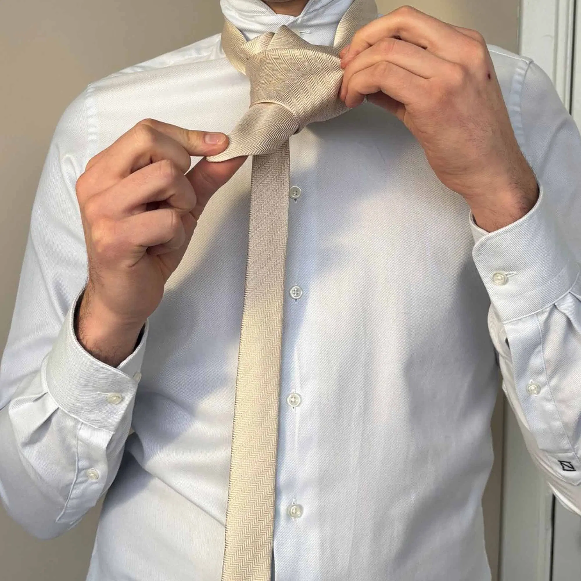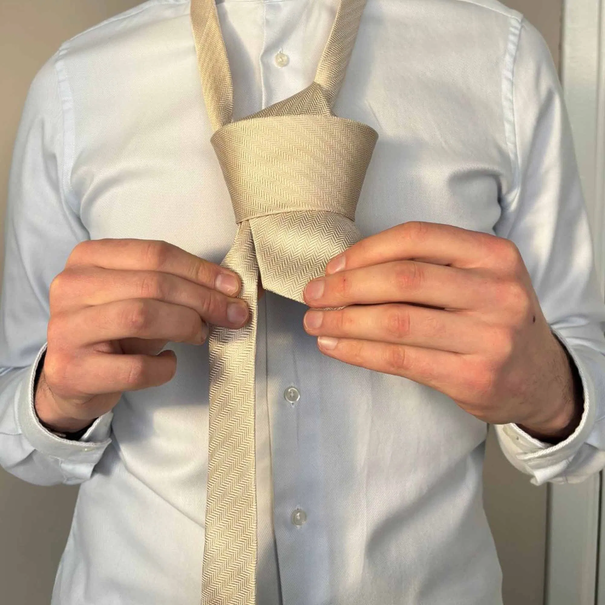 Die Länge eures Körpers bestimmt im Wesentlichen die Länge der Krawatte – beide sollten in einem angemessenen Verhältnis zueinanderstehen. Wenn die untere Spitze der Krawatte gerade den oberen Rand eures Hosenbundes berührt, ist die Länge perfekt.