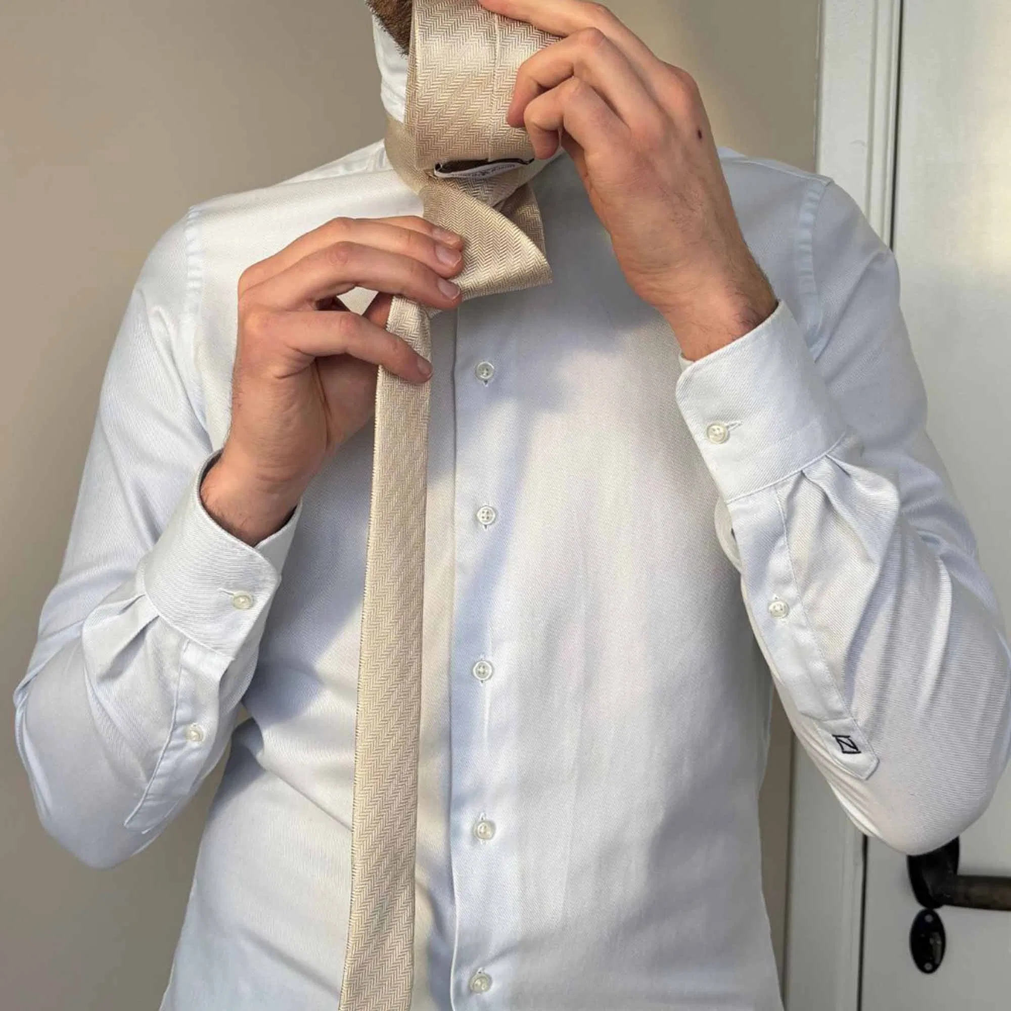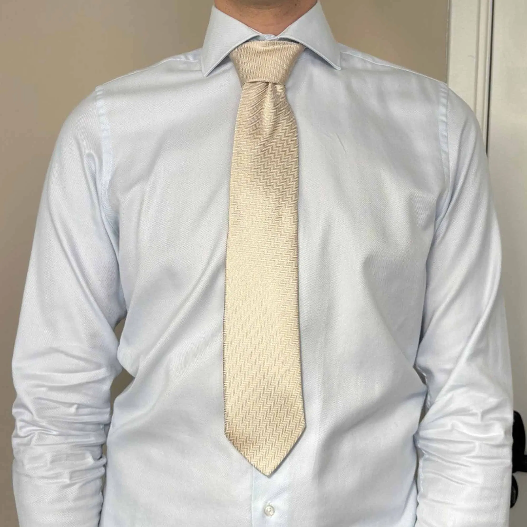 Wenn ihr euer Outfit zusammenstellt, beginnt mit den größten Kleidungsstücken. Wählt zuerst euren Anzug, dann euer Hemd und zuletzt eure Krawatte. Ein weiterer Trick, mit dem man fast nichts falsch machen kann, ist die Wahl eines hellblauen Hemdes. Im Prinzip passt fast jede Krawatte dazu. Das Wichtigste ist, eine Krawattenfarbe zu wählen, die mit der Farbe des Hemdes kontrastiert. Um auf das Beispiel von eben zurückzukommen: Eine hellblaue Krawatte auf einem hellblauen Hemd passt nicht ganz so gut. Ihr möchtet gerne Blau auf Blau tragen? Eine dunkelblaue Krawatte ist passt wieder super zu dem hellblauen Hemd.