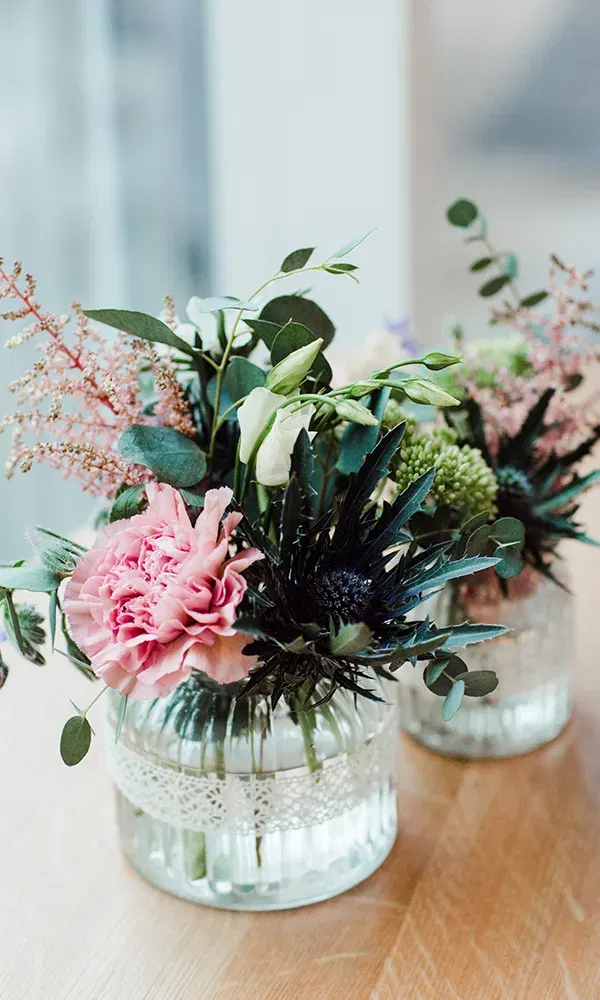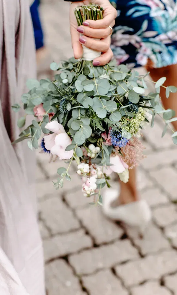 Lauras Brautstrauß von Blumen Flores in Tamsweg war in Créme, Rosa, Blau sowie einzelnen Akzenten aus Edeldisteln und Eukalyptus gebunden.