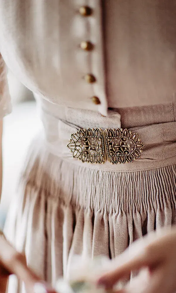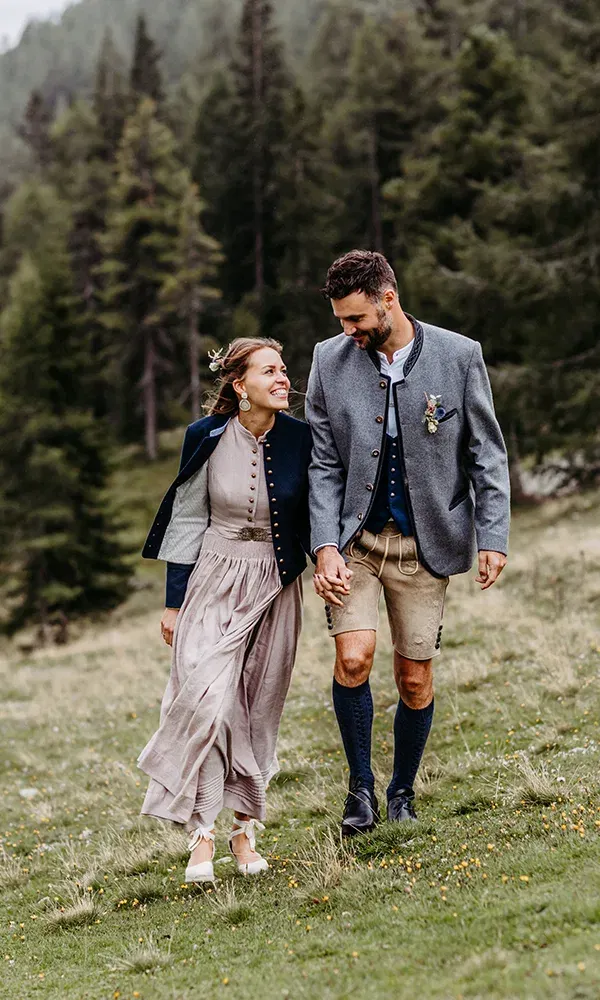 Fotografin Nicky Webb begleitete das Paar bereits seit dem Getting-ready und hielt gekonnt die großen sowie kleinen Momente mit ihrer Kamera fest. Das Shooting fand nachmittags auf der Alm statt. „Diese kurze Foto-Session hat sich ganz natürlich angefühlt, keine gestellten Posen, sondern Gesten und Augenblicke, die aus dem Moment heraus entstanden. Während dieser Zeit entstanden wunderschöne Paarfotos“, so die Braut. Abends, zurück im Tal, blieb dann für die Hochzeitsgäste und das Brautpaar noch genügend Zeit, um das Trachten-Outfit gegen eine sommerlich-elegante Abendgarderobe zu wechseln. Mit Crémant und Flying-Tapas wurden die Gäste auf einen kulinarischen Abend der Extraklasse eingestimmt, gefolgt von einem Vier-Gänge Menü aus der Haubenküche des Mesnerhauses. Ein Freund des Brautpaares sorgte an den Turntables für Partystimmung bis in die frühen Morgenstunden. Am nächsten Tag beim gemeinsamen Brunch sorgte dann noch eine Überraschung der Trauzeugin der Braut – eine eigenes gestaltete Hochzeitszeitung mit vielen wunderbare Beiträgen – für Freudentränen.
