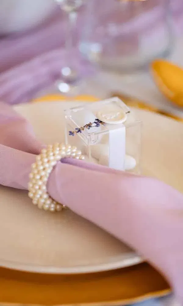 Verteilt auf den Sitzplätzen kleine, feine Geschenkboxen für eure Gäste. Darin sind weiß dragierte Hochzeitsmandeln und ein duftender Lavendelzweig. Mit einem Wachssiegel verschließt ihr die Box edel und elegant.