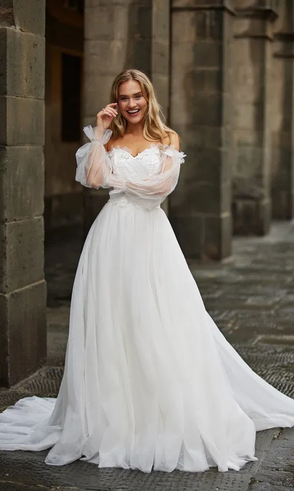 Da kommt die … Märchenbraut! Schon als kleines Mädchen hast du von einer romantischen Hochzeit geträumt – und natürlich von einem traumhaften Sissi-Kleid. Schließlich ist das dein großer Tag, an dem du einmal im Leben eine königliche Robe tragen kannst. Besonders für Bräute mit ausgeprägten Hüften ist dieses Kleid eine wunderschöne Wahl, da es die Silhouette sanft umspielt.