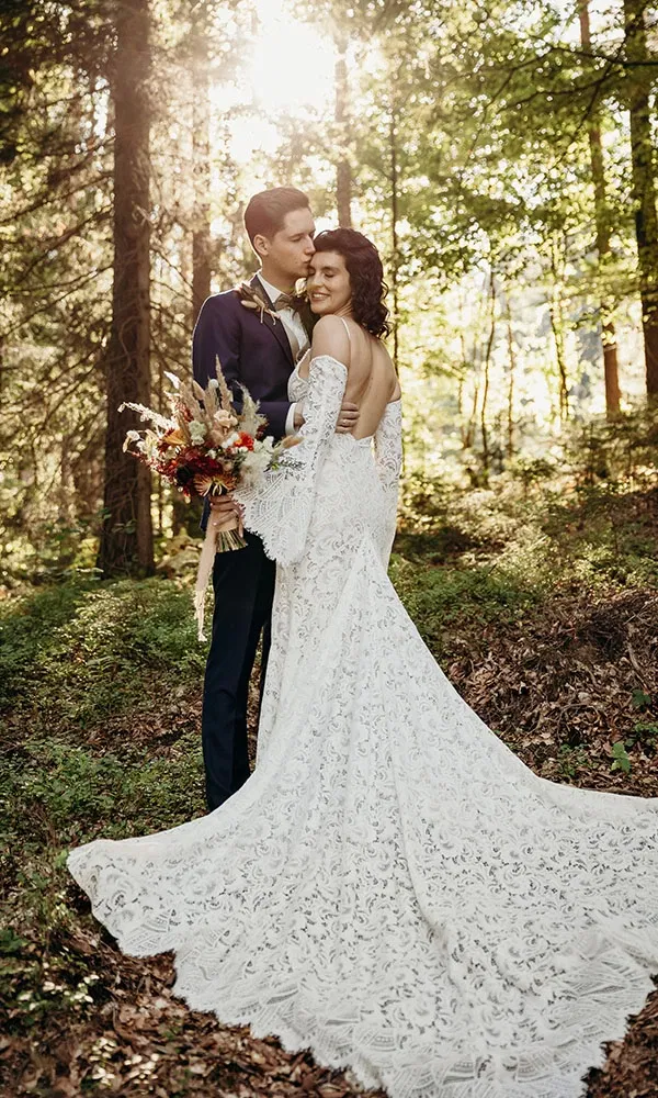 Melanies Boho-Brautkleid war ein echter Glücksgriff – wenn auch keiner auf den ersten Blick. „Ich war im März mit meiner Mama und zwei Freundinnen auf der Suche“, erzählt sie. „In der ersten Boutique fand ich ein Kleid, das mir unglaublich gut gefallen hat – ein Einzelstück aus der Vorjahreskollektion.“ Weil es jedoch ihr allererster Termin war, wollte Melanie sich noch umsehen. „Ich dachte mir, ich sollte noch vergleichen – aber als ich zurückkam, war das Kleid schon verkauft. Ich war total enttäuscht.“ Bei einem weiteren Termin in der Boutique Bespoke Bridal kam dann alles anders. „Die Beraterin meinte, ich solle dieses eine Kleid doch einmal anprobieren. Ich war skeptisch – ich war mir sicher, das steht mir nicht.“ Und dann passierte es: „Es hat perfekt gepasst – figurbetont, aus zarter Spitze, mit einer eleganten Schleppe. Genau das, was ich mir eigentlich gewünscht hatte.“ In den letzten Minuten des Termins fiel die Entscheidung – spontan, aber goldrichtig. „Im Nachhinein war es einfach das perfekte Kleid.“ Ein besonderes Detail: Die abnehmbaren Ärmel sorgten für einen wandelbaren Look zwischen Trauung und Feier – romantisch, modern und ganz im Boho-Stil der gesamten Hochzeit.