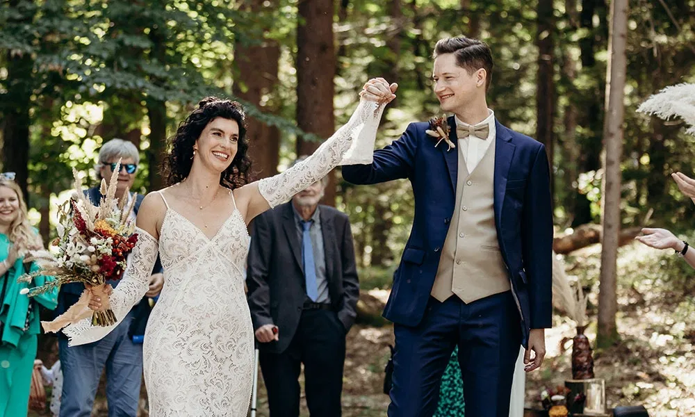 Melanie und Christoph gaben sich mitten im Wald das Jawort, umgeben von 75 Gästen, darunter auch viele Kinder. „Die Location hat dort einen kleinen Platz liebevoll hergerichtet, mit ein paar rustikalen Holzbänken und einem Bogen.“ Ihre Hochzeit fand am 20. September statt – genau in einem kurzen Zeitfenster zwischen regnerischen Tagen. „Eigentlich war rundherum das Wetter schon richtig herbstlich“, erinnert sich Christoph. „Aber genau an unserem Wochenende war es plötzlich warm – fast 30 Grad. Wir hatten so ein Glück!“ Die Sonne fiel sanft durch die Bäume, das Licht tanzte zwischen den Blättern, und der frühe Herbst verlieh der Szenerie eine warme, goldene Stimmung. „Es war einfach friedlich“, sagt Melanie lächelnd.