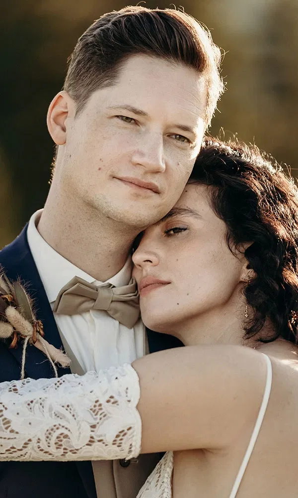 Auch Christophs Outfit fand seinen Weg mit Unterstützung: „Ich habe meinem Trauzeugen die Aufgabe gegeben, ein paar Herrenausstatter in Wien herauszusuchen“, erzählt er. „Er hatte drei oder vier auf der Liste und ich war dann schließlich bei zwei davon. Bei einem habe ich mich sofort wohlgefühlt – die Beratung war einfach top.“ Die Entscheidung fiel auf einen klassischen Anzug in Navyblau, kombiniert mit einer beigen Weste und Fliege. „Über die Accessoires wollten wir trotzdem den Boho-Vibe aufgreifen“, erzählt Christoph. Melanie ergänzt: „Christoph hatte einen kleinen Anstecker aus Trockenblumen in Beige- und Rosttönen, passend zu meinem Brautstrauß.“