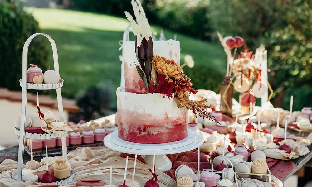 Der Traubogen war bereits Teil der Location – eine geschwungene Konstruktion aus Weide, die sich wunderbar in die natürliche Umgebung einfügte. „Diesen Bogen konnte man individuell schmücken lassen“, erzählt Melanie. „Unser Blumenthema war herbstlich, in warmen Creme-, Terrakotta-, Dunkelrot- und Lachstönen, kombiniert mit Trockengras. Ein echter Boho-Traum.“ Die Floristin setzte das Konzept bis ins Detail um: Vom Traubogen über die Tische bei der Agape bis hin zur festlichen Tafel zog sich der Stil wie ein roter Faden durch das gesamte Setting. Selbst die Hochzeitstorte wurde mit Blumen in denselben Farben verzier: ein stimmiges, liebevoll gestaltetes Gesamtkonzept.