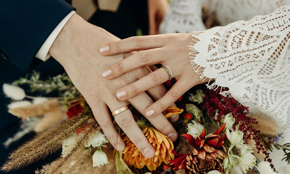 Ihre Eheringe fanden Melanie und Christoph bei einem Juwelier in Wien, ganz in der Nähe ihres Wohnbezirks. „Den Verlobungsring hatte ich schon bei einem Juwelier ums Eck gefunden“, erzählt Christoph. „Deshalb lag es nahe, auch die Trauringe dort anfertigen zu lassen.“ Für die beiden war schnell klar, dass ihre Ringe nicht identisch sein sollten. Christophs Modell ist schlicht, roségolden und matt, mit einer persönlichen Gravur auf der Innenseite. Melanies Ring dagegen ist ein echter Hingucker: „Ich habe meinen Ring selbst designt“, erzählt sie. „Er ist ebenfalls aus Roségold und hat einen zarten Farbverlauf aus kleinen Edelsteinen, von Hellblau bis Hellgrün.“