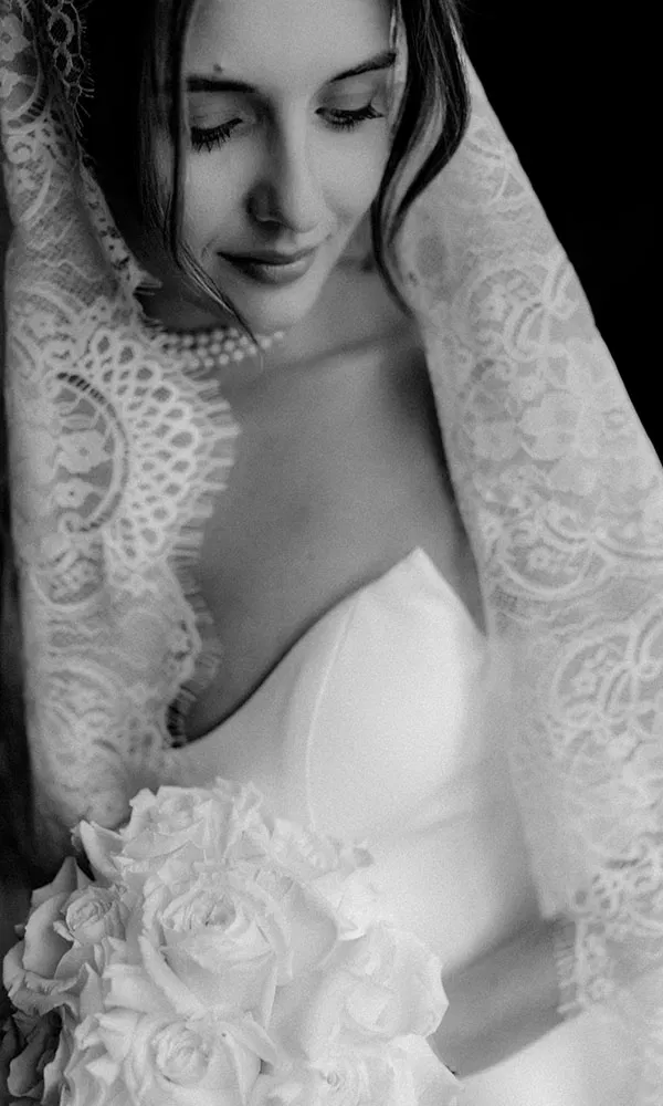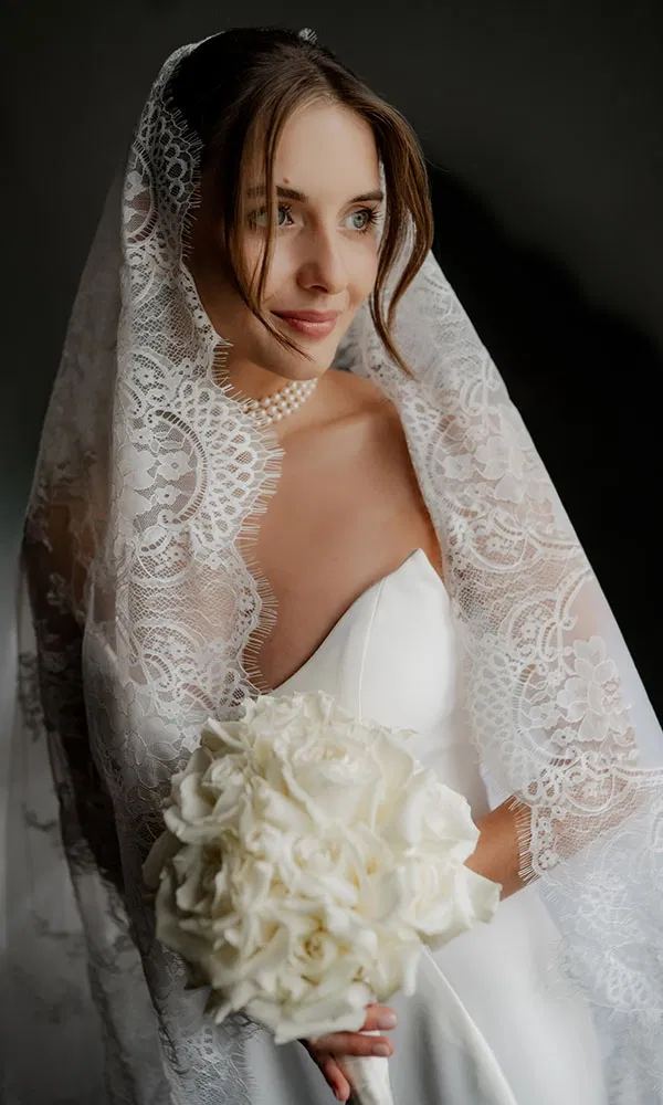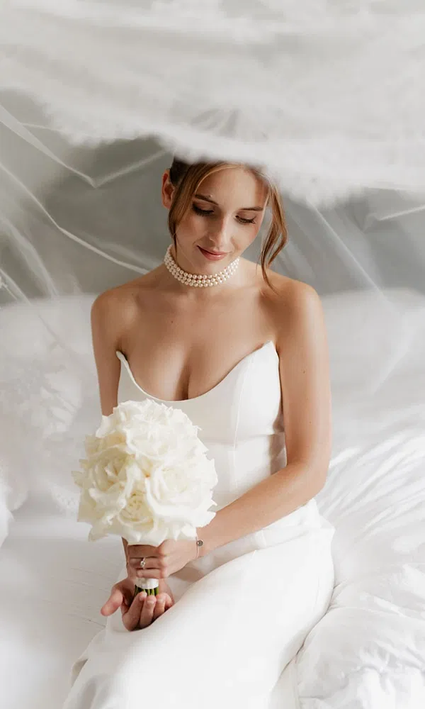 Beim Brautkleidkauf wurde Julia von ihrer Mama und ihren beiden Trauzeuginnen Katja – die auch beim Antrag dabei war – und Nina begleitet. „Wir sind in ein Brautmodengeschäft gegangen, von dem ich schon durch Freundinnen wusste, dass sie dort ihr Traumkleid gefunden hatten“, erzählt sie. Und tatsächlich: Schon im ersten Geschäft wurde sie fündig. „Ich probierte sicher sieben oder acht Kleider an, aber keines hat sich richtig angefühlt“, erinnert sich Julia. „Und dann hatte ich das eine Kleid an – schlicht, wunderschön – und ich wusste sofort: Das ist es!“ Die Entscheidung fiel schnell und eindeutig. Ihr Look blieb insgesamt zurückhaltend und elegant. „Das Kleid war eigentlich sehr schlicht“, sagt sie, „aber ich hatte einen langen Spitzenschleier, drei Meter lang, der das Ganze perfekt ergänzte.“ Nach der Trauung legte sie den Schleier ab und kombinierte stattdessen transparente Handschuhe, die dem Outfit einen modernen, verspielten Touch verliehen. „Ich mag eher schlichte Looks“, erklärt sie, „aber mit dem Schleier und den Handschuhen hatte das Kleid genau das gewisse Etwas.“