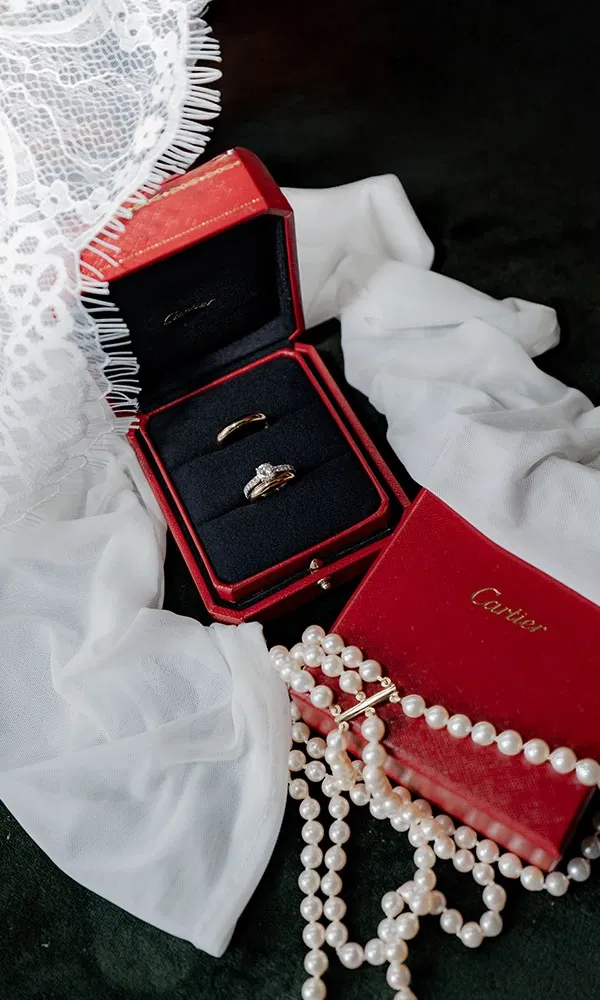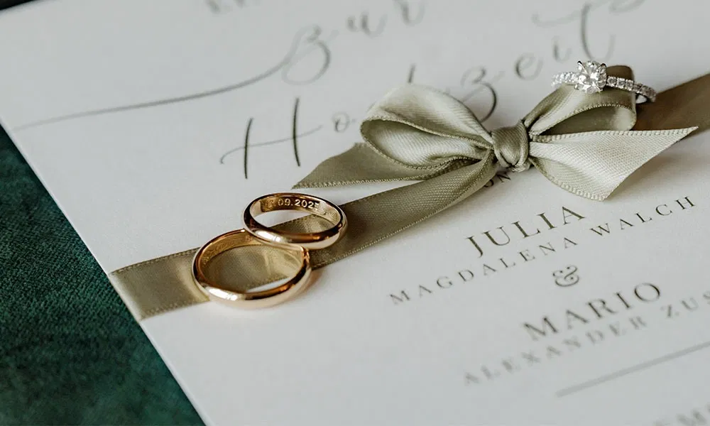 „Die Idee zu unseren Eheringen kam von mir“, erzählt Julia. „Ich wollte ganz klassische Ringe aus Gelbgold – schlicht, elegant und zeitlos.“ Sie entschieden sich schließlich für identische Ringe. „So, wie man sich klassische Eheringe eben vorstellt“, sagt sie mit einem Lächeln. Fündig wurden die beiden bei Cartier. „Ich habe seinen Ring gekauft und er meinen“, erzählt die Braut.