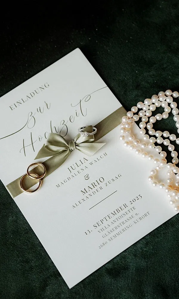 Die Umgebung der Villa war so stimmungsvoll, dass das Paar kaum zusätzliche Dekoration benötigte. „Wir hatten nur ein paar Blumenarrangements auf den Tischen – kräftig bunt, aber trotzdem modern und zeitlos“, erzählt Julia. Ein festgelegtes Farbkonzept gab es nicht, doch das dunkle Grün der Papeterie zog sich dezent durch das Gesamtbild. So entstand ein harmonischer, moderner Look mit natürlichen Akzenten. „Die Blumen waren definitiv ein Highlight“, erinnert sie sich. „Sie wurden bereits in hübschen Vasen geliefert, was uns viel Zeit ersparte.“