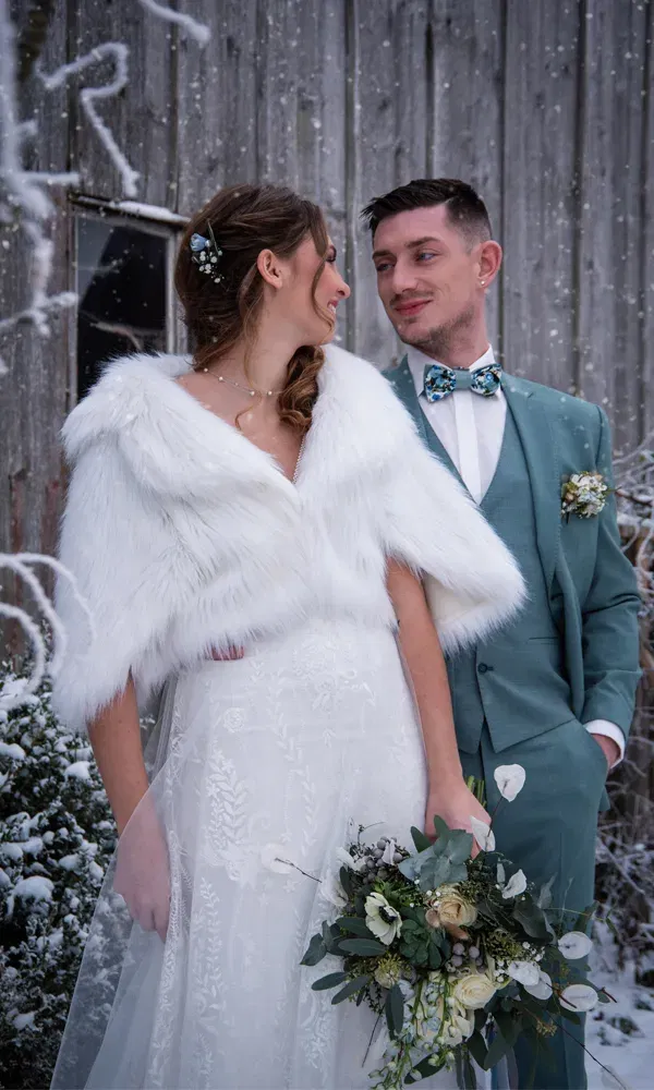 Wenn du an eine Winterhochzeit denkst, kommen dir vielleicht gemütliche Kaminmomente, sanft fallende Schneeflocken und… dich warm einpacken in den Sinn. Genau hier kommen Stolen und Capes ins Spiel. Sag dem kalten Schauer ade und heiße diese stilvollen und warmen Accessoires willkommen. Fangen wir mit der Stola an, vor allem die aus Kunstpelz. Locker über die Schultern geworfen, verleiht sie dir sofort königlichen Winterglanz. Und dann gibt es noch das Cape. Es ist elegant und traumhaft. Ob du dich für ein langes, fließendes Cape oder eine kürzere Version für zusätzlichen Stil entscheidest, du wirst es nicht bereuen.