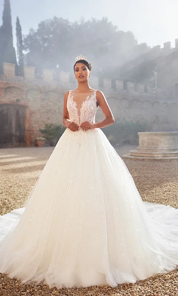 Bild links: Majestätisches Ballkleid mit glitzerndem Tüllrock und zarter Illusionsspitze – für einen königlichen Auftritt wie aus dem Märchenbuch.