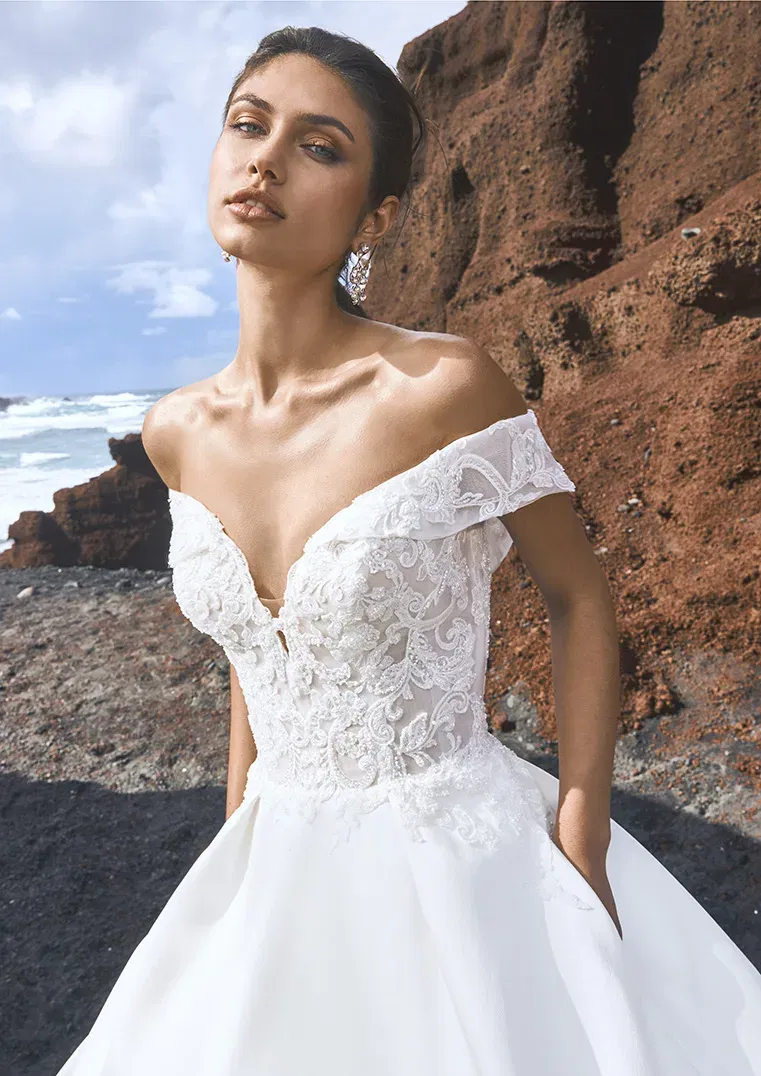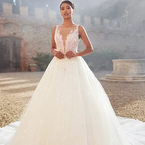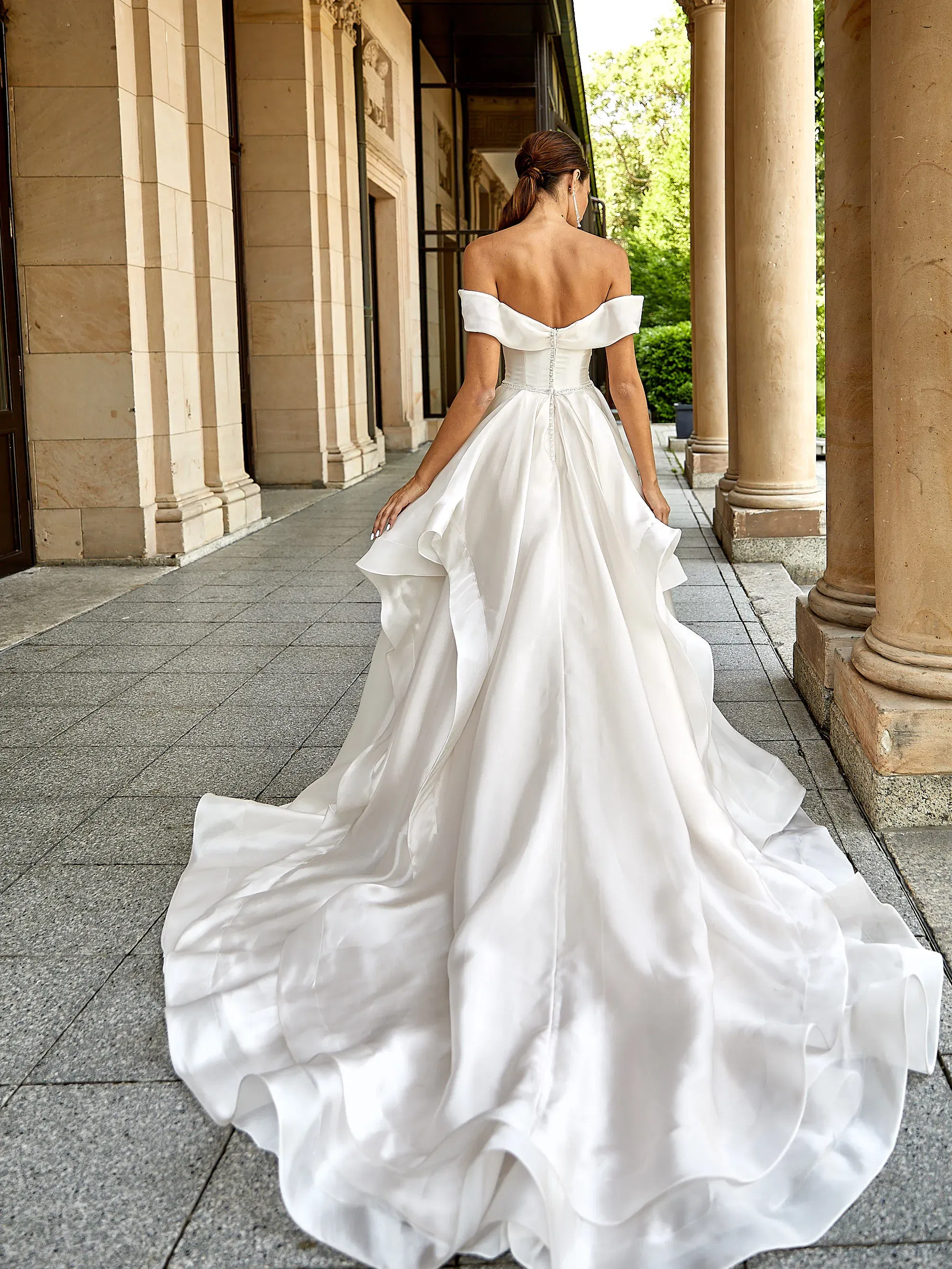- Voluminöser Rock: Der klassische Ballkleid-Schnitt betont die Taille und fließt in einen voluminösen, oft mehrlagigen Rock aus Tüll oder Organza. Dieser Look zaubert eine majestätische Silhouette und verleiht der Braut eine königliche Ausstrahlung.