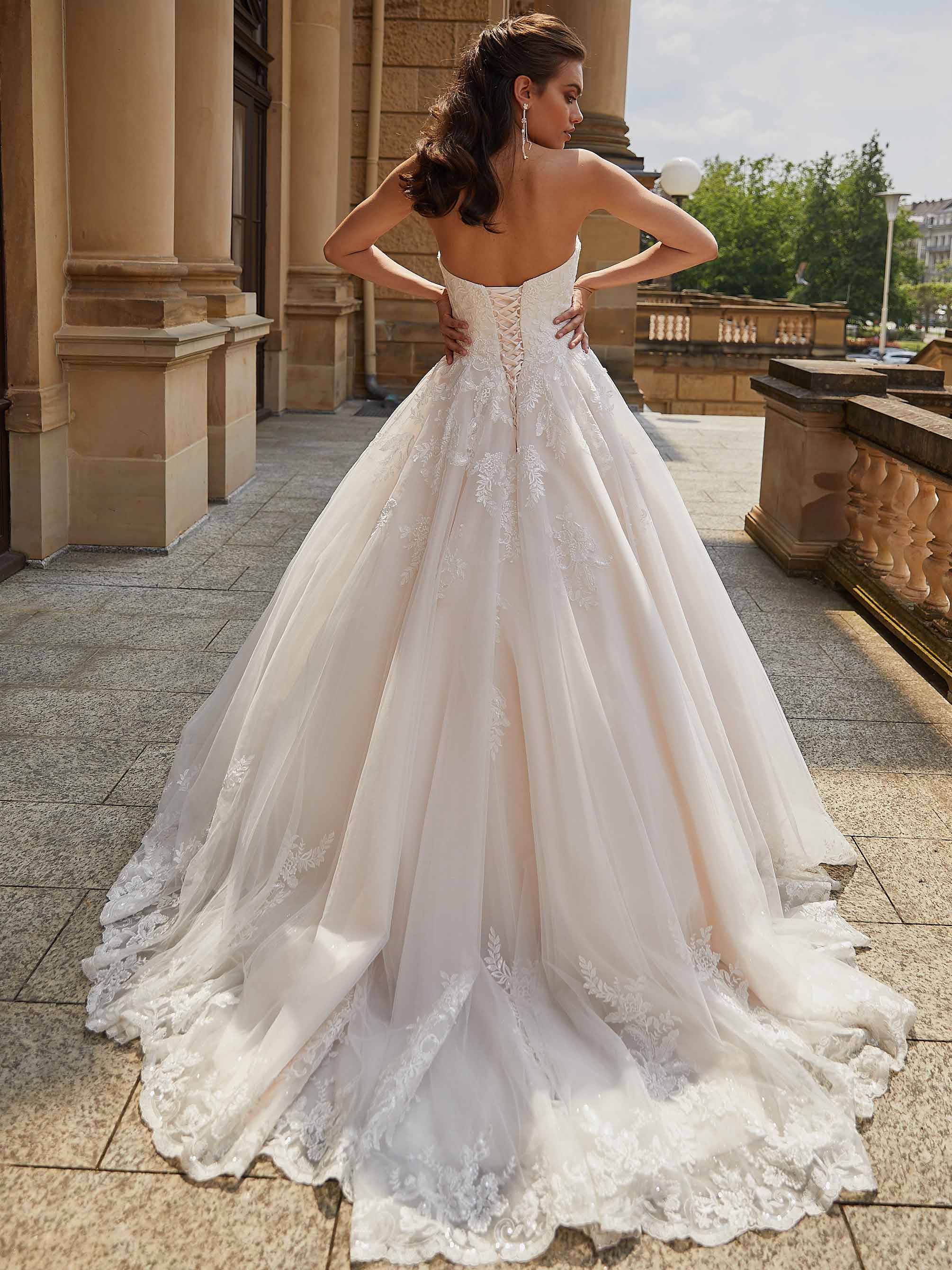 Bild rechts: Raffiniert bis ins Detail: Der Rücken dieses Brautkleids begeistert mit eleganter Schnürung, zarter Spitze und einer langen, majestätischen Schleppe – perfekt für den großen Auftritt.