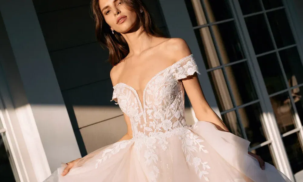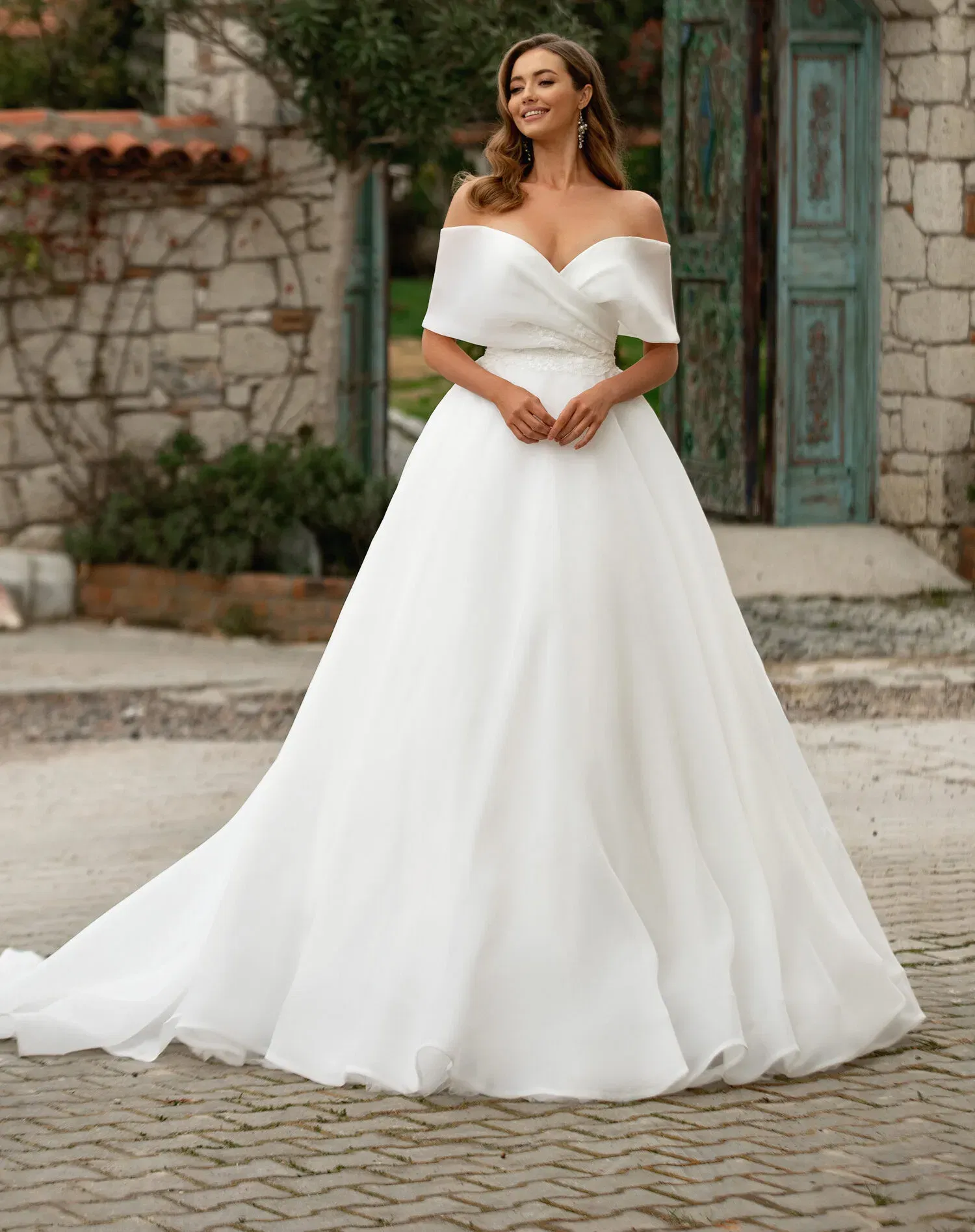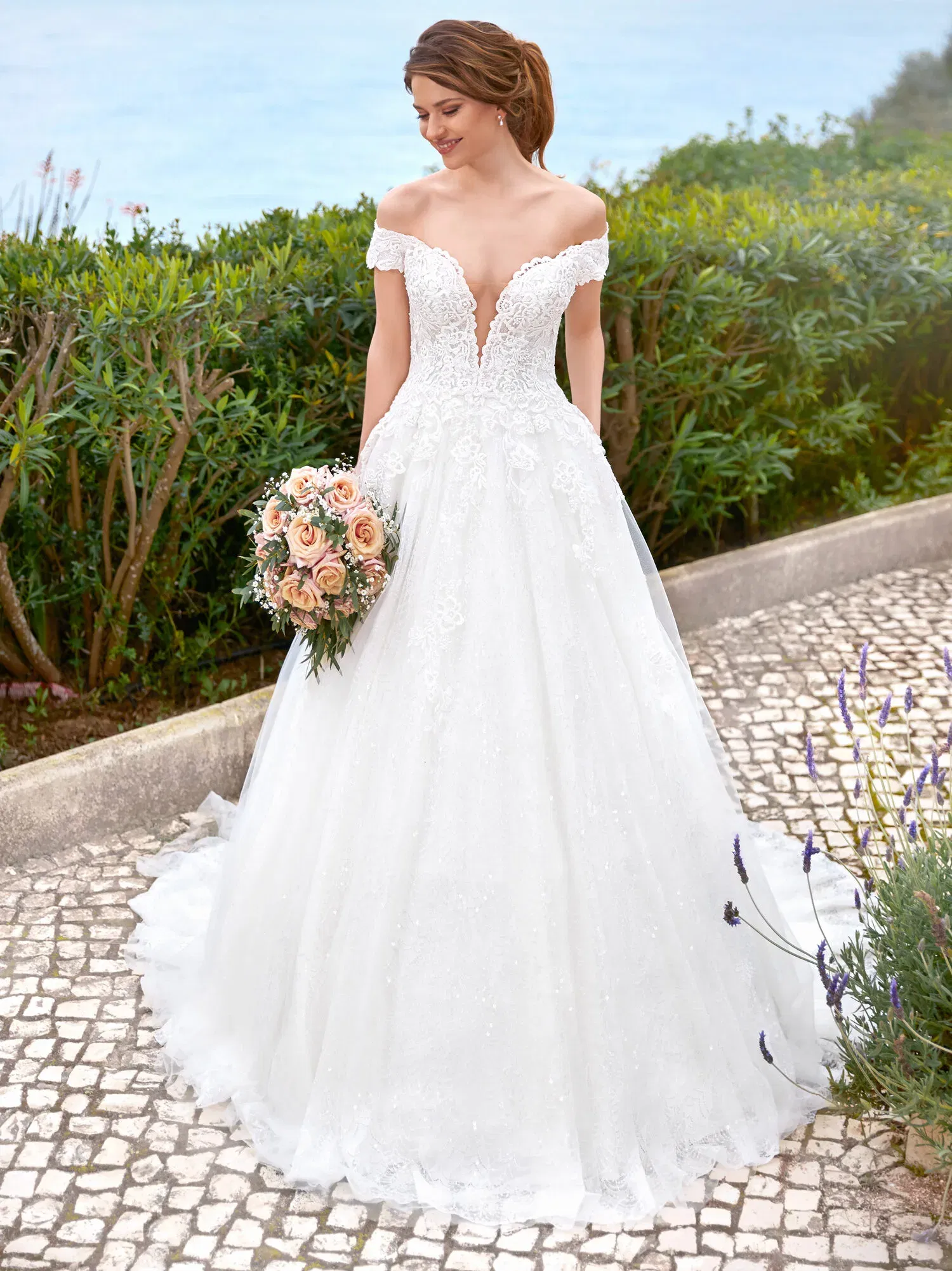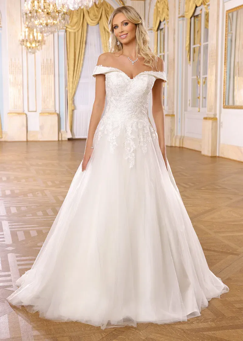 Romantik pur mit moderner Note: Dieses Brautkleid im Sissi-Stil verzaubert mit floraler Spitze, Off-Shoulder-Trägern und einem voluminösen Tüllrock – ideal für einen royalen Auftritt mit zeitgemäßem Flair.