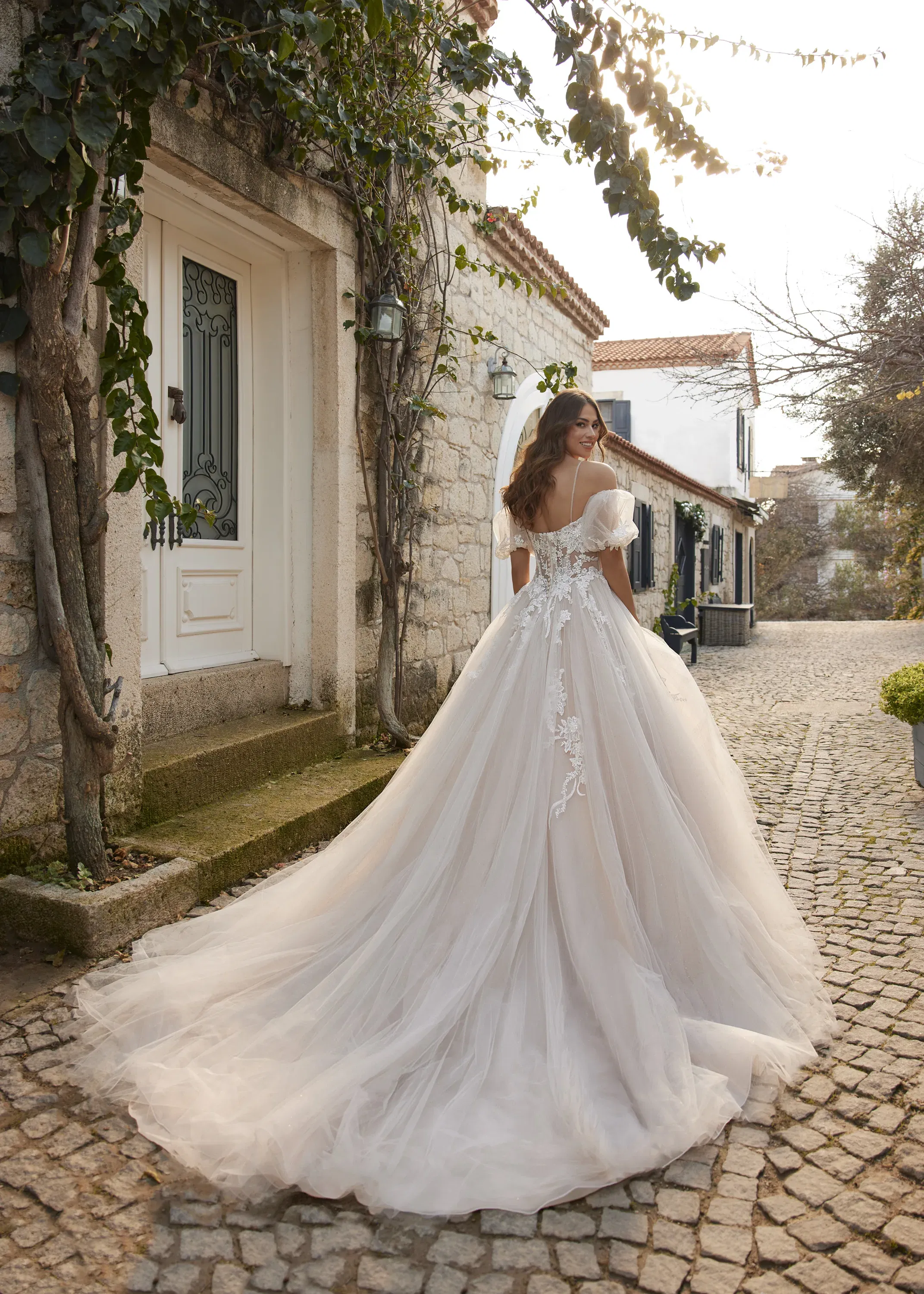 Bild rechts: Ein Hauch von Märchen: Das traumhafte Tüllkleid mit floraler Rückenverzierung und zarten Off-Shoulder-Trägern verleiht jeder Braut einen königlichen Auftritt.