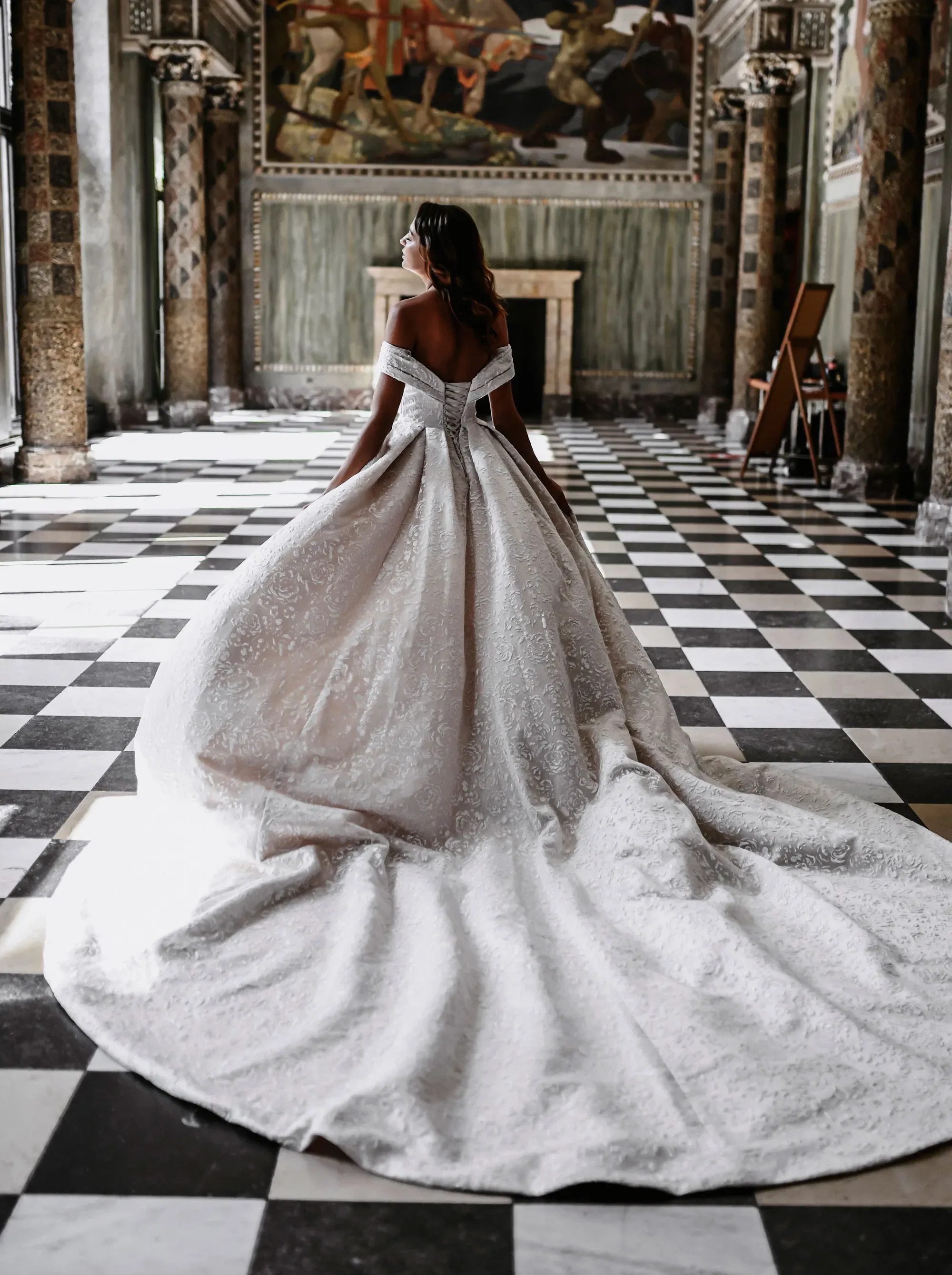 Bild rechts: Mit floraler Spitze, zarter Off-Shoulder-Linie und majestätischer Schleppe verkörpert dieses Kleid den romantischen Prinzessinnen-Look in seiner schönsten Form – perfekt für eine märchenhafte Traumhochzeit.