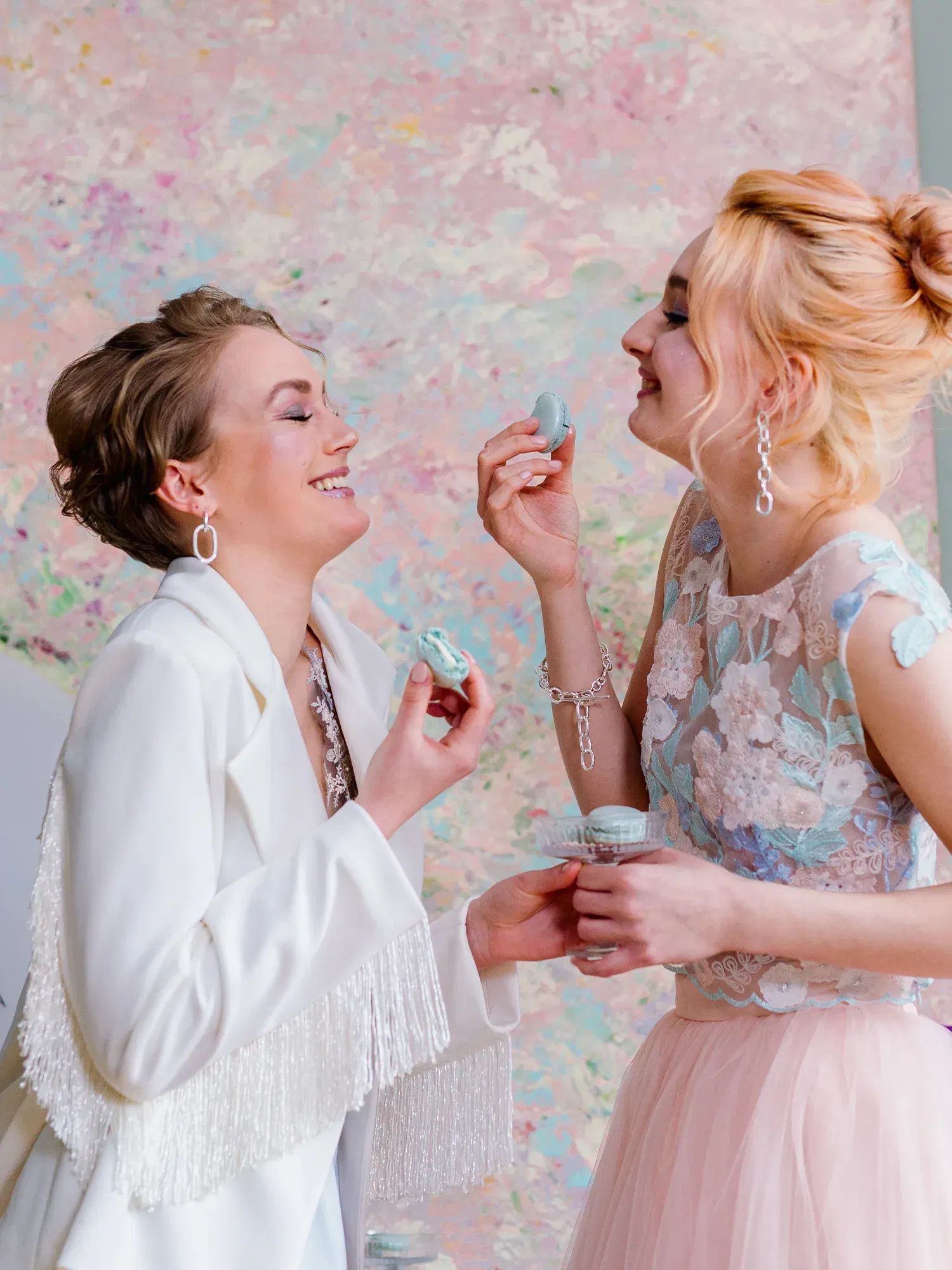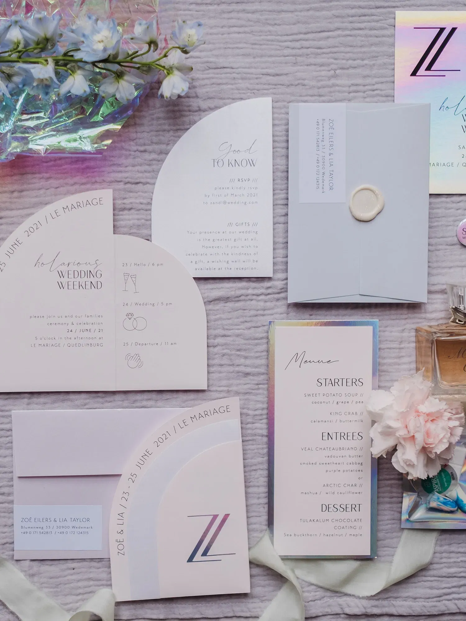 Die wichtigsten Highlights? Holografische Farbwelten, zarte Pastellnuancen und stylische Details von der Papeterie über die Tischdekoration bis hin zum Essen. Dazu eine inklusive, liebevolle Atmosphäre, in der sich jede/r willkommen fühlt. Und natürlich: eine ausgelassene Party voller Musik, Licht und Lebensfreude.