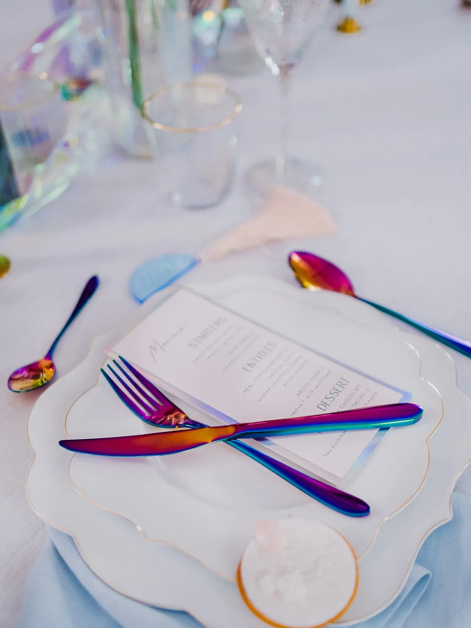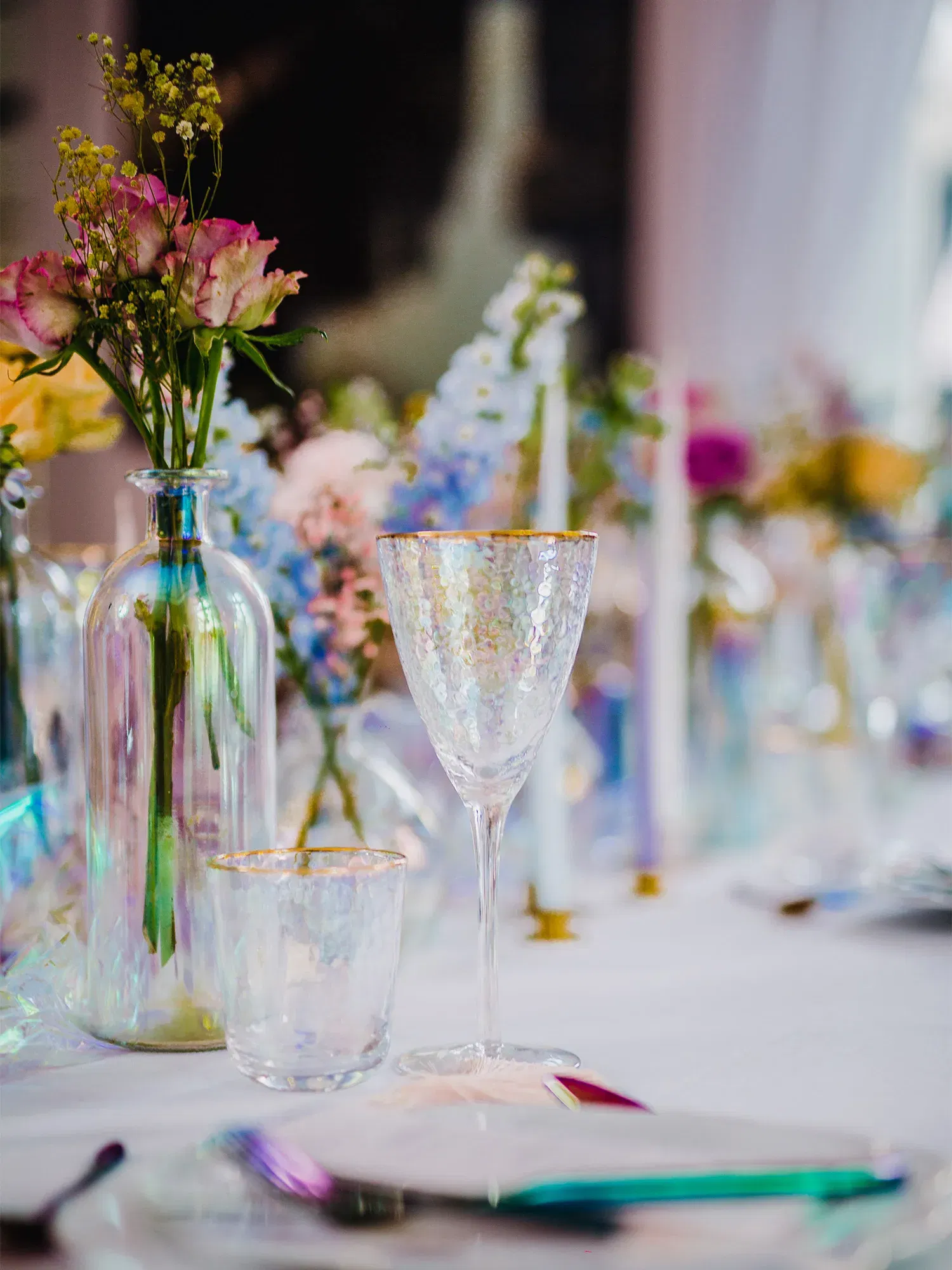 Ein absoluter Tipp: Kombiniert irisierende Gläser mit glänzendem Besteck und funkelnden Dekoelementen – so entsteht ein atemberaubendes Lichtspiel, das eure Gäste verzaubert und eure Hochzeit in ein schillerndes Kunstwerk verwandelt.