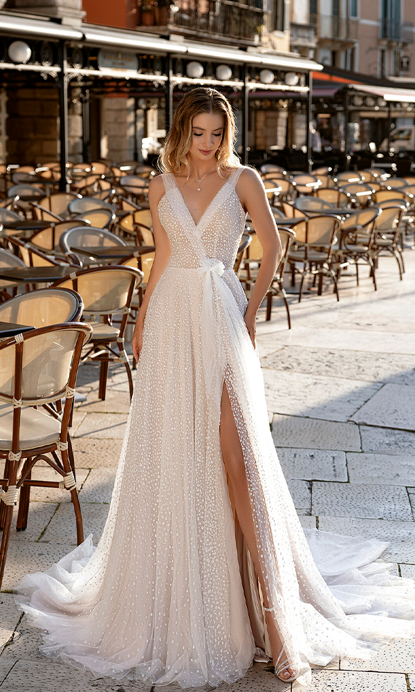 Hinreißend süß: Der Liebreiz, den dieses einzigartige Design aus der Kollektion Eglantine auf den ersten Blick ausstrahlt, verführt auf den zweiten Blick mit einer echten Portion Sexappeal. Das niedliche Pünktchenmuster täuscht Unschuld vor, aber der transparente Tüllstoff und der hohe, verführerische Beinschlitz erzählen eine ganz andere Story.