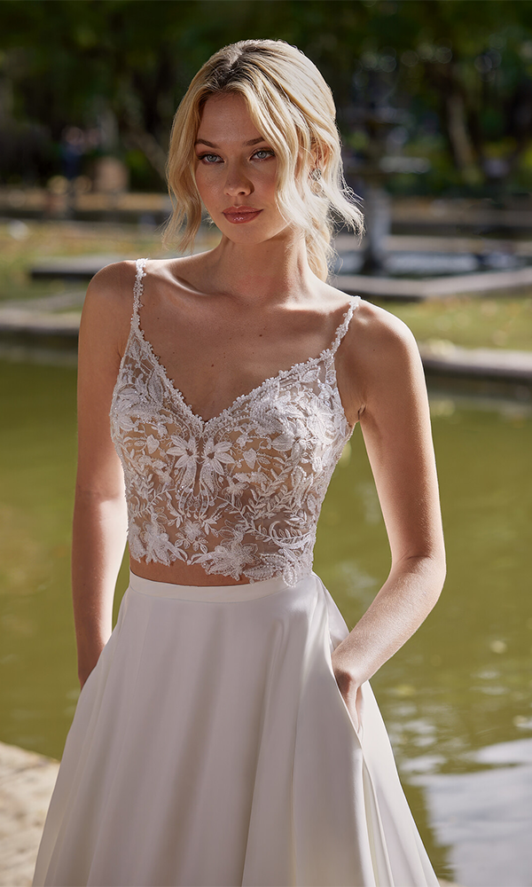 Auch dieses hinreißende Ensemble von Libelle Bridal lässt seine Trägerin am Hochzeitstag nicht mit Reizen geizen. Das transparente Top verzaubert mit feingliedrigster Blütenspitze und entzückenden Perlendetails. Der schlichte A-Linien-Seidenrock sorgt für bräutliche Eleganz und lässt den Bauch der Braut ganz nonchalant und stilvoll unter dem Zweiteiler hervorblitzen.