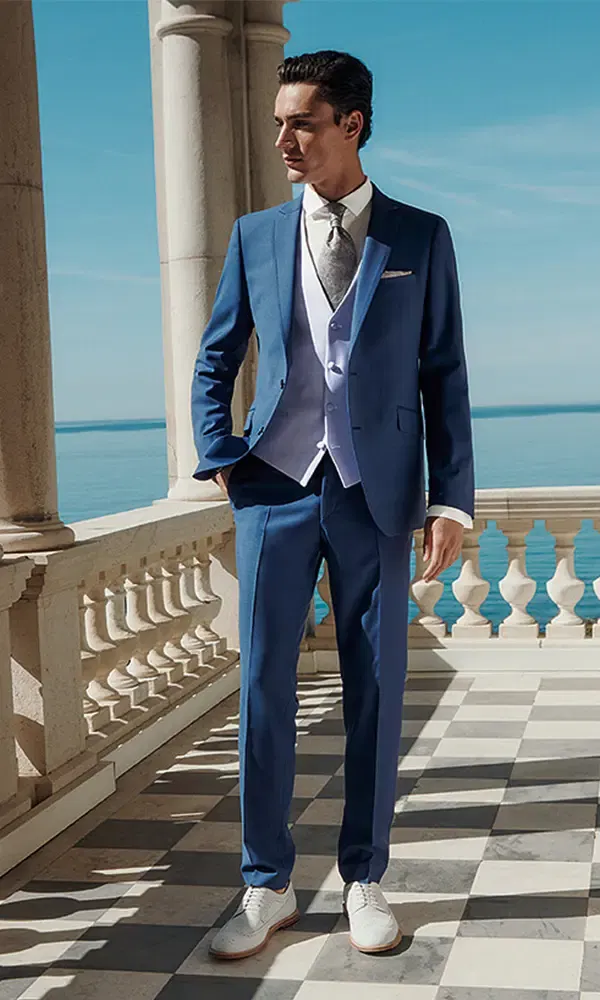 Der Bräutigam trägt einen eleganten Dreiteiler in einem strahlenden Blauton, der durch seine klare Linienführung und hochwertige Verarbeitung besticht. Das tailliert geschnittene Sakko mit schmalem Revers wird durch eine dezente Weste und eine perfekt abgestimmte Hose ergänzt. Dieser Look wirkt souverän, modern und ist sowohl für eine festliche Hochzeit im Ballsaal als auch für eine elegante Outdoor-Zeremonie bestens geeignet.