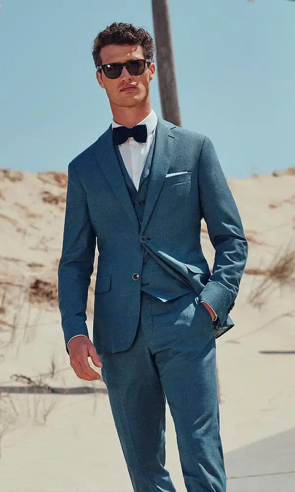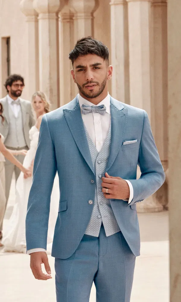 Blau bietet dir eine erfrischende Abwechslung zu den traditionellen Schwarz- oder Grautönen und ermöglicht es dir als Bräutigam, Persönlichkeit und Individualität auszudrücken, während du dennoch elegant und zeitlos wirkst. In den unterschiedlichsten Schattierungen verfügbar, von sanftem Himmelblau bis hin zu tiefem Marineblau, bietet Blau eine Vielzahl von Optionen, die zu jeder Art von Hochzeitszeremonie und jedem Hauttyp passen. Ein blauer Anzug kann sowohl bei formellen Anlässen als auch bei entspannteren Feiern getragen werden. Er hat also den Vorteil, dass du ihn auch nach deiner Hochzeit noch auf unterschiedlichsten Anlässen tragen kannst, ohne overdressed zu wirken. Außerdem lässt ein blauer Hochzeitsanzug sich hervorragend mit einer Vielzahl von Stoffmustern, Accessoires und Farbkombinationen abstimmen.