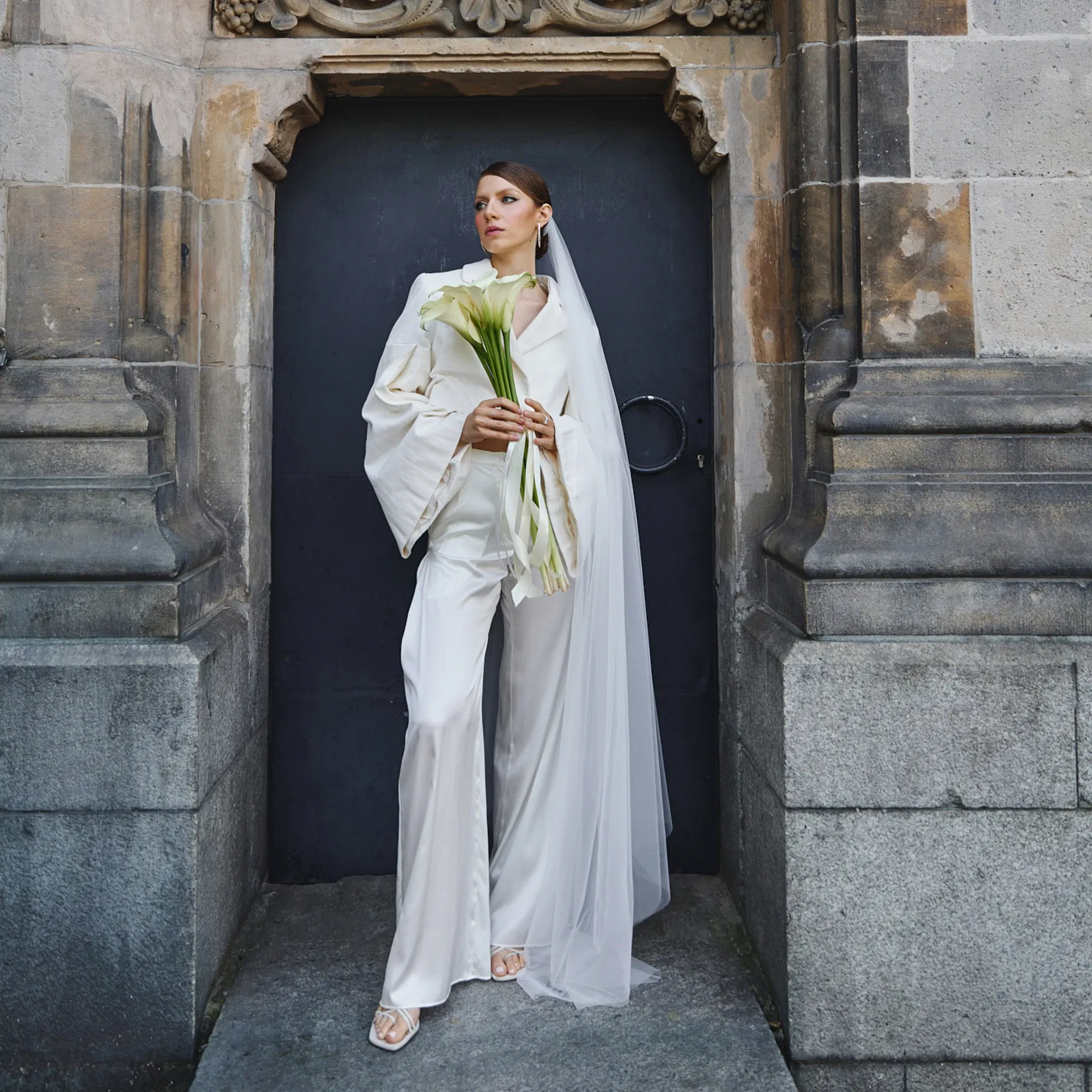 Wer nicht gerne Kleider oder Röcke trägt, kann sich für einen Jumpsuit oder eine Hose entscheiden. Bei einer Hose empfehlen sich Modelle wie Chinos oder elegante Stoffhosen. Vermeidet auffällige Muster und sorgt dafür, dass eure Kleidung eine ruhige und edle Ausstrahlung hat.