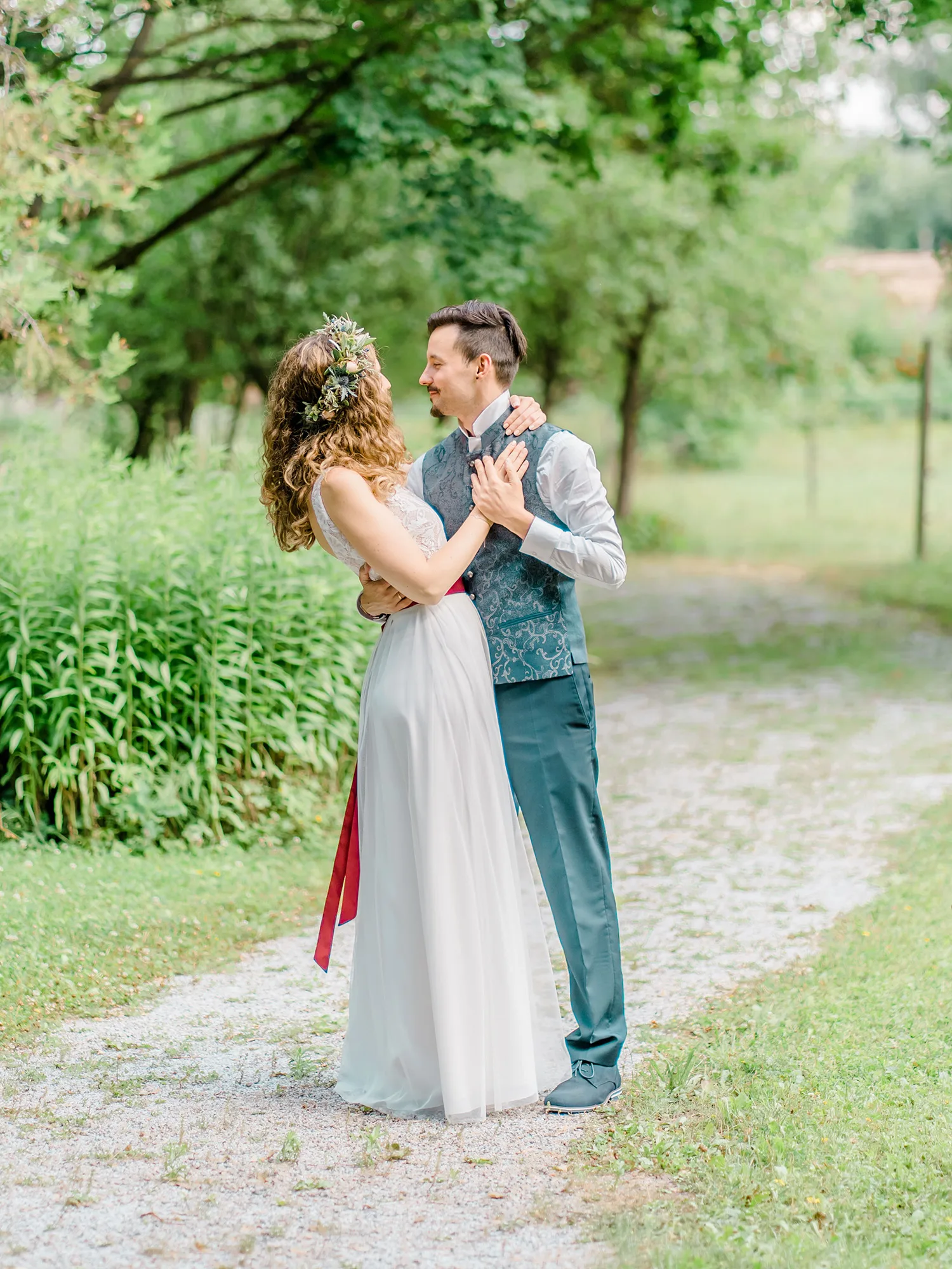 „Zusammen mit unserer Wedding-Plannerin Jacqueline Deininger von ‘Ja von Herzen’ haben wir unseren schönsten Tag mit 80 Gästen in Hayingen geplant. Nach der kirchlichen Trauung ging es zum Feiern auf Schloss Ehrenfels auf der Schwäbischen Alb. Wichtig war uns, dass alle immer eine Beschäftigungsmöglichkeit haben. Für die großen Gäste mieteten wir eine Fotobox. Für die kleinen Gäste hatten wir Malsachen und Riesenseifenblasen organisiert. Vor unserem Hochzeitstanz konnten wir unseren Gästen noch eine spektakuläre Feuershow bieten.“