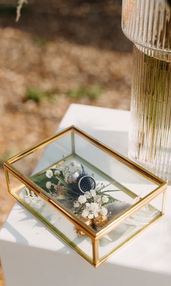 Überlegt euch eine zum Stil der Hochzeit passende Präsentation der Ringe. Feiert ihr eine Boho-Hochzeit am Strand, dann legt die Schmuckstücke in eine große, weiße Muschel oder knüpft sie an ein Makramee-Band. Näht ihr gern? Dann kreiert ein eigenes Ringkissen mit euren Initialen oder legt sie in eine mit Blumen und Blättern ausgepolsterte Ringschatulle, die es auch in transparent gibt.