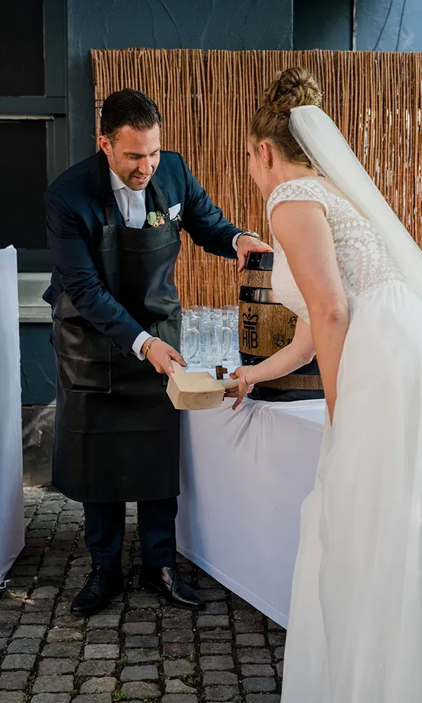 Nach Gratulationen und Sektempfang vor der Kirche hatten die frisch Vermählten ein kurzes Shooting im Pfarrgarten. Im Korso ging es nun zur Location. „Als Autofan war mir diese Fahrt mit meinem Mercedes SL Oldtimer besonders wichtig. Mit dem geschmückten Wagen als Lead-Fahrzeug vor den Autos unserer Lieben – das war sehr cool“, schwelgt Flo in Erinnerungen. Statt des hochzeitstypischen Tortenanschnitts entschied sich das Paar für eine besonders bayerische Aktion: Zu herzhaften und süßen Snacks am Nachmittag zapfte der Bräutigam ein Bierfass an. „Sehr zur Belustigung unserer Hochzeitsgäste, denn es hat ganz schön gedauert, bis es geklappt hat“, lacht die Braut.