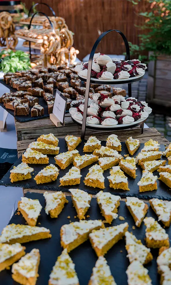 Zum Diner servierte das Team der Villa Flora ein hervorragendes 3-Gänge-Menü mit Burrata, Rinderfilet und Crème brûlée. „Vor allem beim Nachtisch waren wir kritisch, weil wir die Crème nur gut finden, wenn die Kruste knackig ist. Das Küchenteam erfüllte unsere Erwartungen perfekt“, freut sich Flo. Nach dem Essen ging die Hochzeitsgesellschaft zum Brautstraußwurf nochmal ins Freie. „In dieser Zeit räumte das Location-Team einige Tische zur Seite“, berichtet Lara. Auf der frei geräumten Tanzfläche eröffneten die frisch Vermählten nun mit einem kurzen Hochzeitstanz die Party. „Wir haben keine richtigen Tanzschritte gemacht, sondern uns nur ein bisschen im Takt unseres Lieblingssongs von MoTrip bewegt. Gleich nach der ersten Strophe holten wir unsere Hochzeitsgäste dazu“, schmunzelt der Bräutigam. Als Mitternachtssnack kam für Lara nur eines infrage: Döner. „Das hat die Villa eigentlich nicht auf der Karte. Für uns wurde das aber extra organisiert“, so Lara begeistert. Bis um 5.30 Uhr wurde noch kräftig gefeiert.