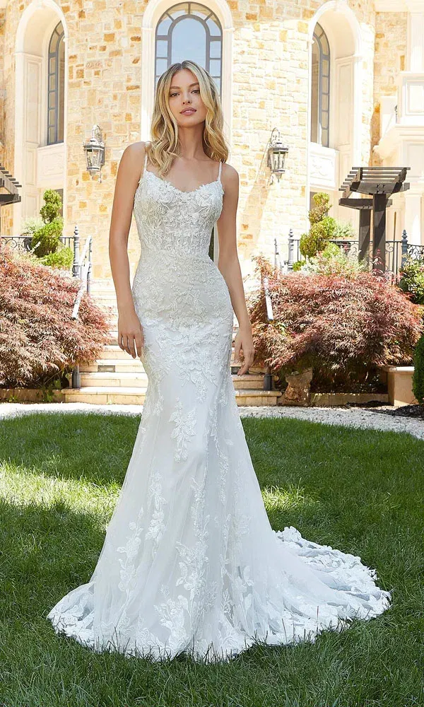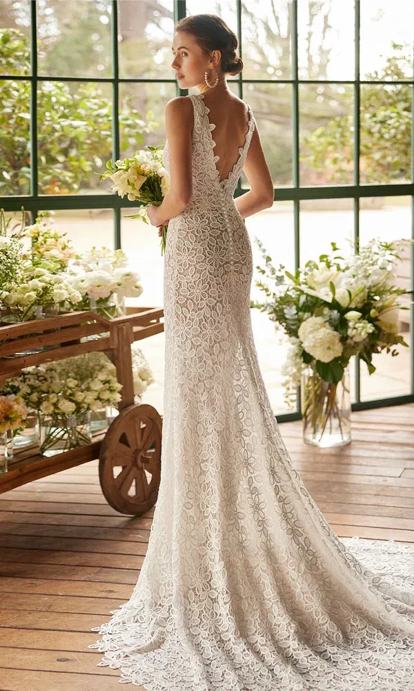 Bild links: Dieses Brautkleid aus zarter Spitze betont die Silhouette und verzaubert mit romantischem Rückenausschnitt.