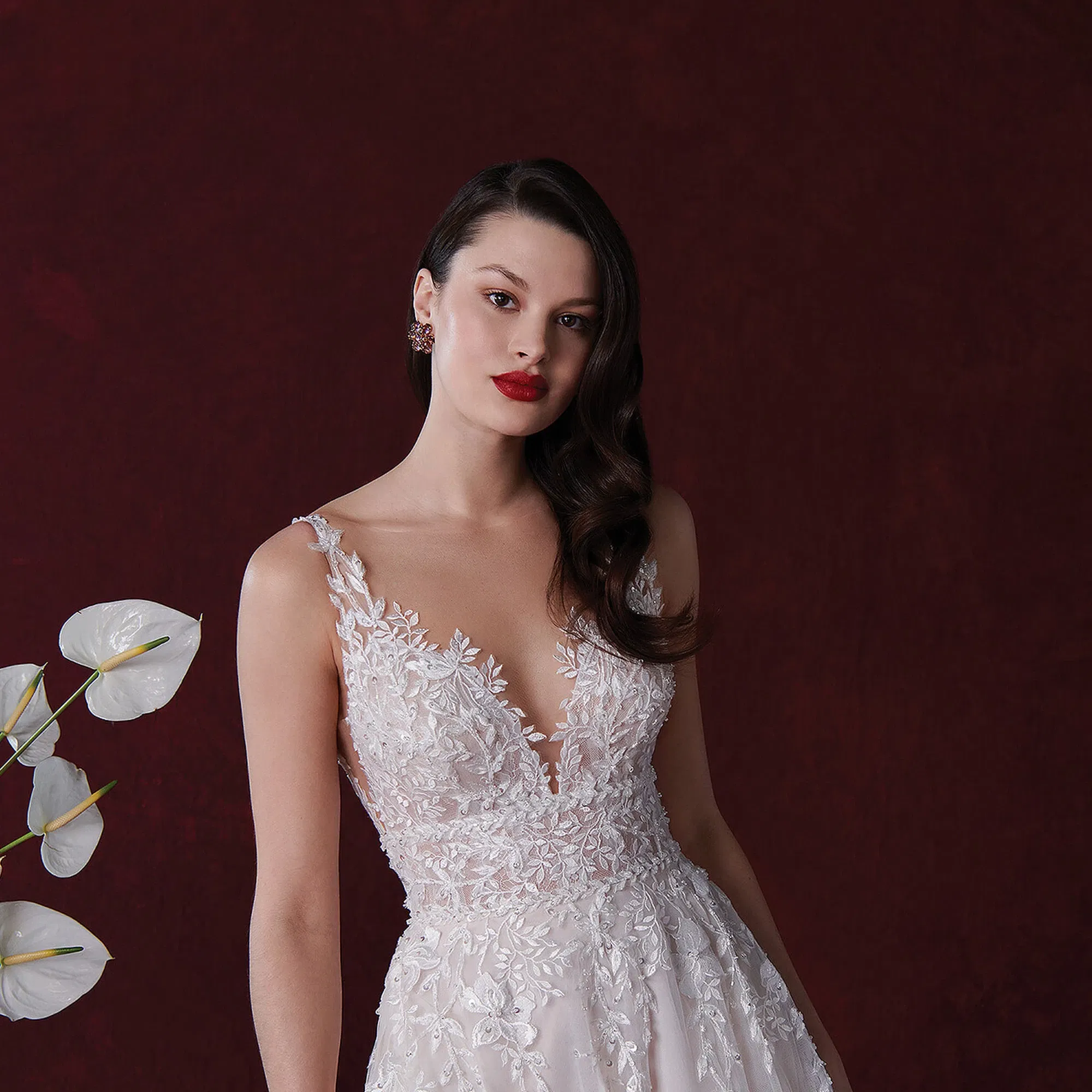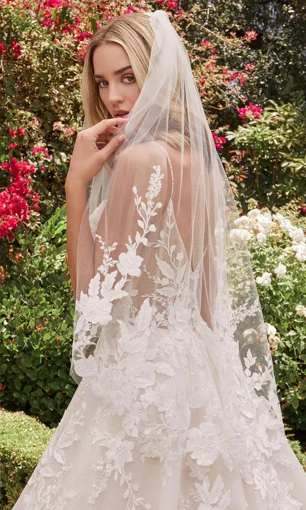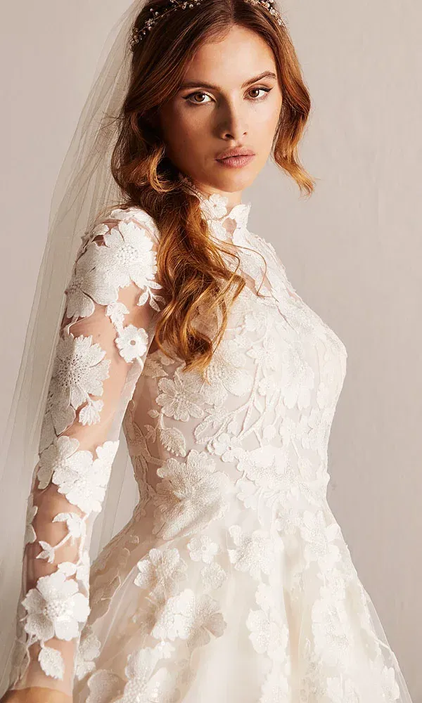 Bild links: Transparente Ärmel und kunstvolle 3D-Blüten machen dieses Kleid zu einem echten Klassiker mit modernem Twist.