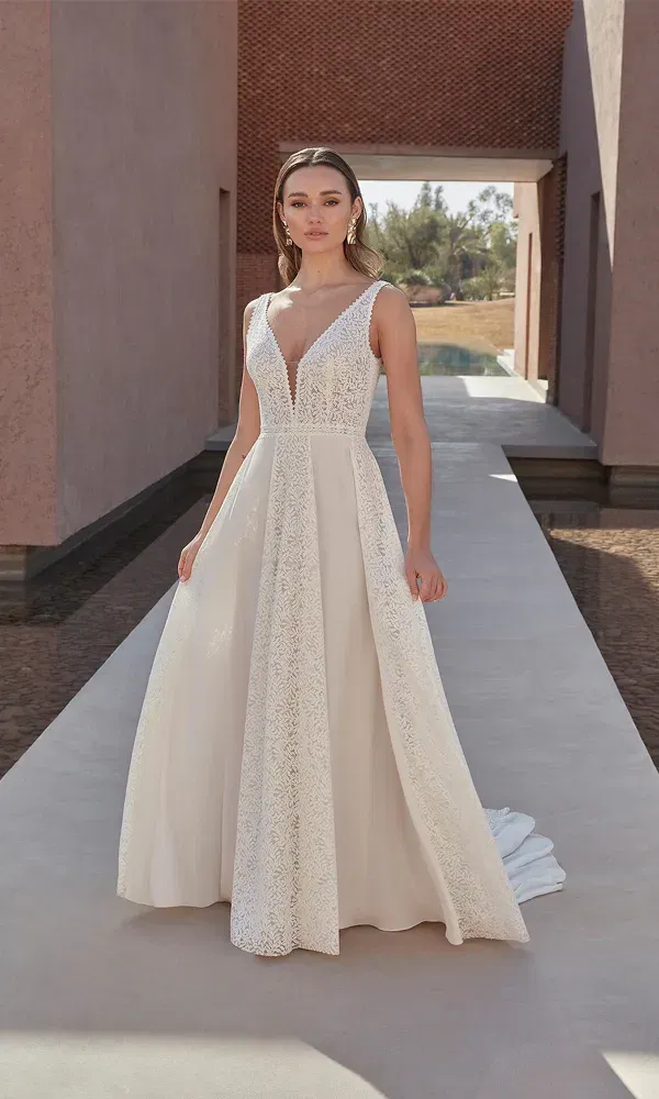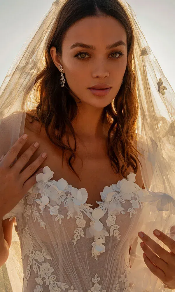 Spitze ist heute so vielfältig wie nie zuvor. Seit der aufwendigen Reticella-Spitze, die Muster aus Blüten und Ranken in Handarbeit entstehen ließ, hat sich die Anzahl der Spitzenarten erheblich vergrößert. Besonders in der Brautmode sind feine Chantilly-Spitze, die in floralen Mustern auf Tüll gestickt wird und den Kleidern einen femininen, romantischen Charme verleiht, sehr beliebt. Französische Guipure- und irische Häkelspitze hingegen versprühen Vintage-Flair und sind ideal für leichte Boho-Brautkleider. Florale Applikationen sorgen zudem für faszinierende 3D-Effekte, die jedes Brautkleid einzigartig machen.