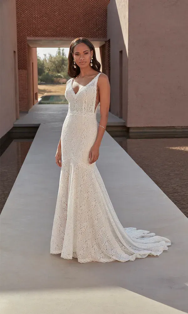 Bild links: Ganz und gar aus luftiger Häkelspitze gefertigt, erinnert diese körpernah geschnittene Robe von Rosa Clara an die Optik von Muscheln oder Meerjungfrau-Schuppen. Wie gemacht für eine Sommer-Hochzeit!