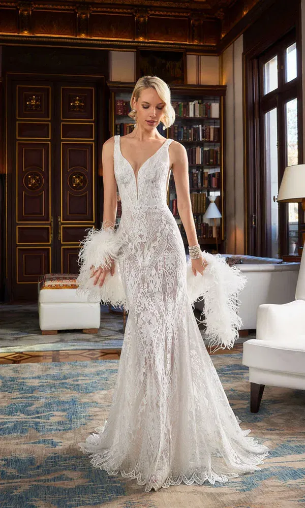 Bereits im 15. Jahrhundert waren die Venezianer von der feinen Spitze fasziniert, einem Gewebe, das aus Garn zu filigranen Ornamenten gefertigt wird und die Haut zwischen den Musterlinien verführerisch durchscheinen lässt. Einst nur den Reichen und Mächtigen vorbehalten, begeistert dieses edle Material heute die gesamte Modewelt – insbesondere in der Brautmode.