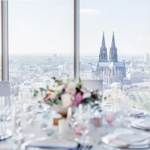 Im Triangle-Turm sagt ihr 100 Meter über den Dächern von Köln Ja – ein Trauort, der durch seine spektakuläre Aussicht besticht. Ihr genießt einen Panoramablick über die gesamte Stadt bis ins Siebengebirge, ins Bergische Land und bis in die Eifel. Mit einer Kapazität von 50 bis 250 Personen eignet sich KölnSKY nicht nur für die Zeremonie, sondern auch für eine ausgedehnte Feier mit euren Gästen in exklusiver Atmosphäre.