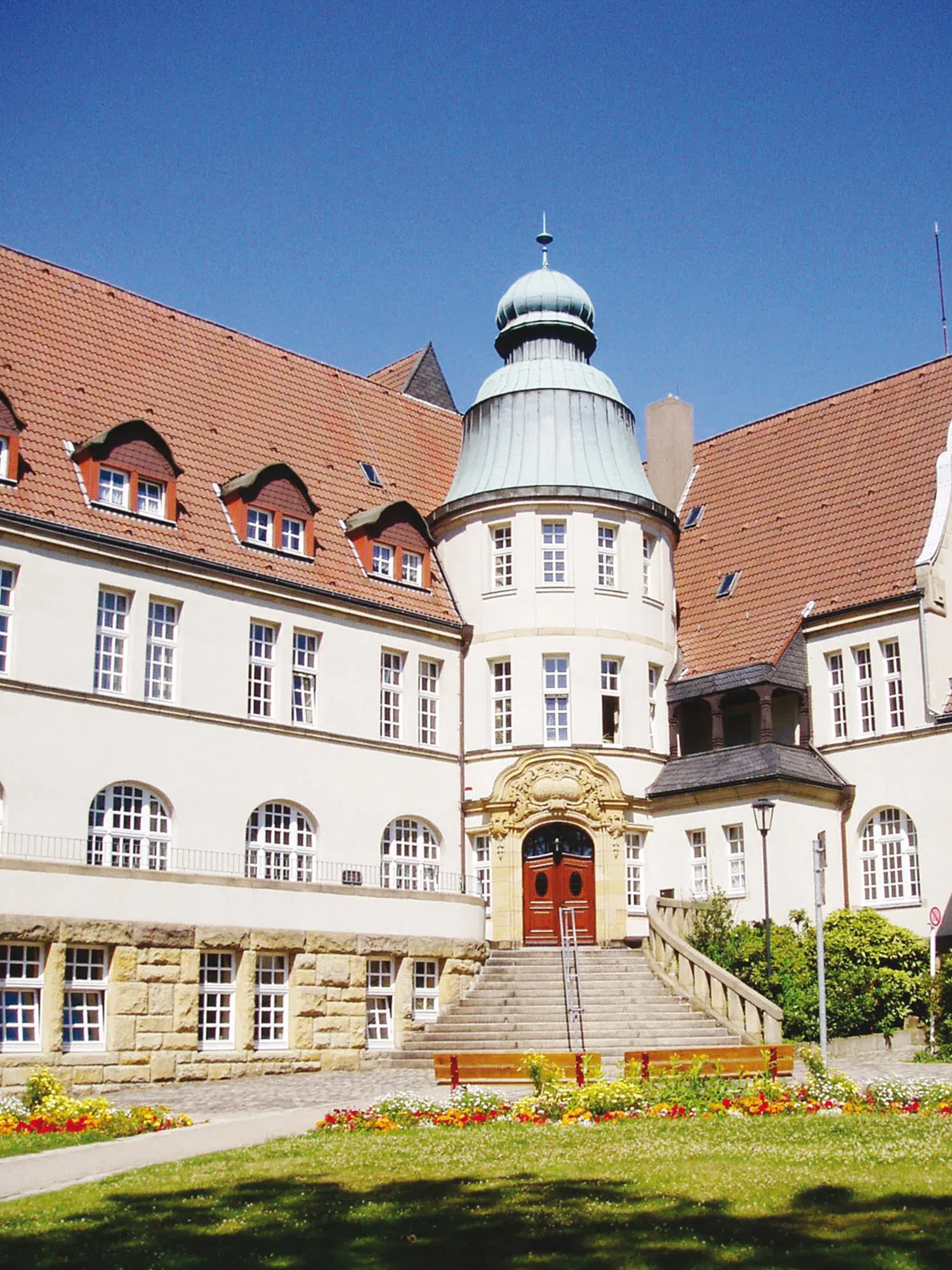 Das Rathaus Kray, errichtet 1907, besticht durch historische Holzvertäfelung und moderne Möblierung im Ratssaal. Der Raum wirkt gleichzeitig repräsentativ und warm. Üblicherweise finden Trauungen freitags und samstags vormittags statt.