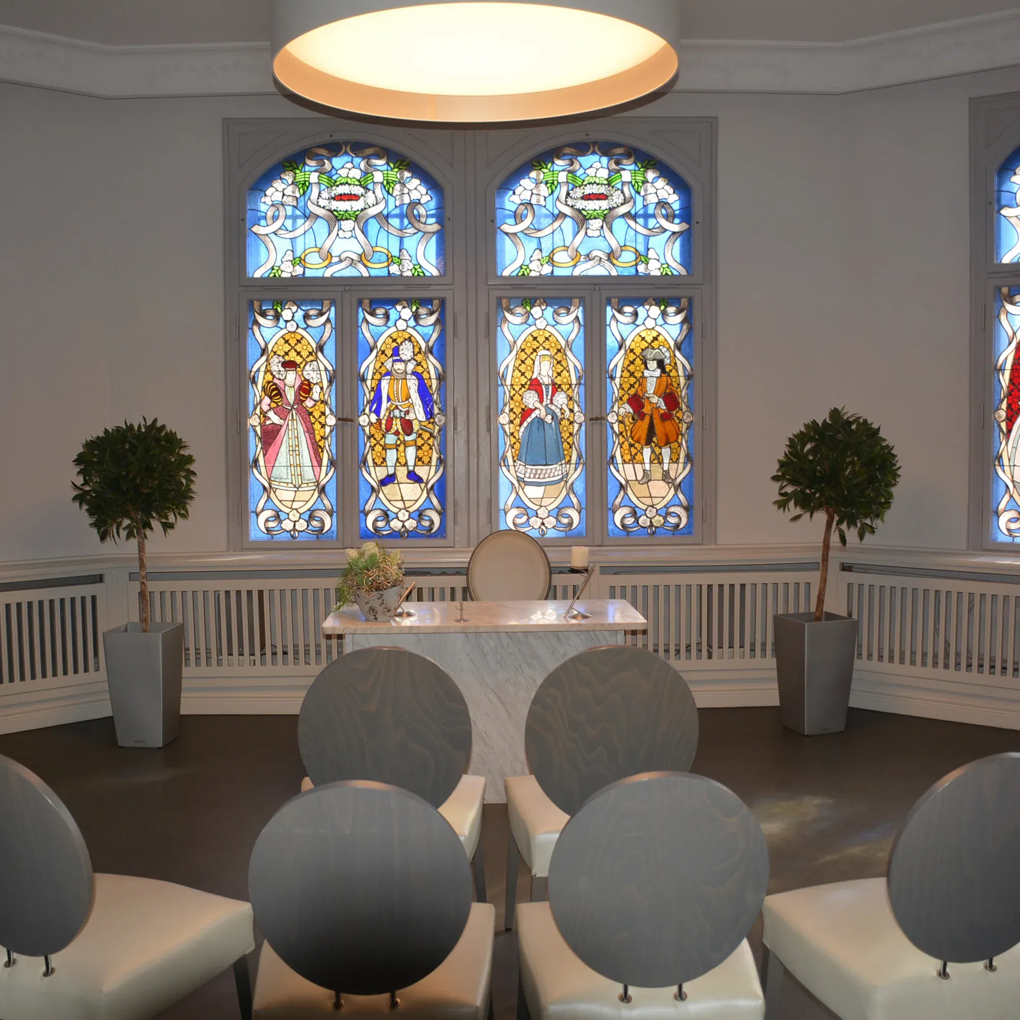 - Der historische Trauraum in der Kapelle besticht durch seine kunstvollen Mosaikfenster.